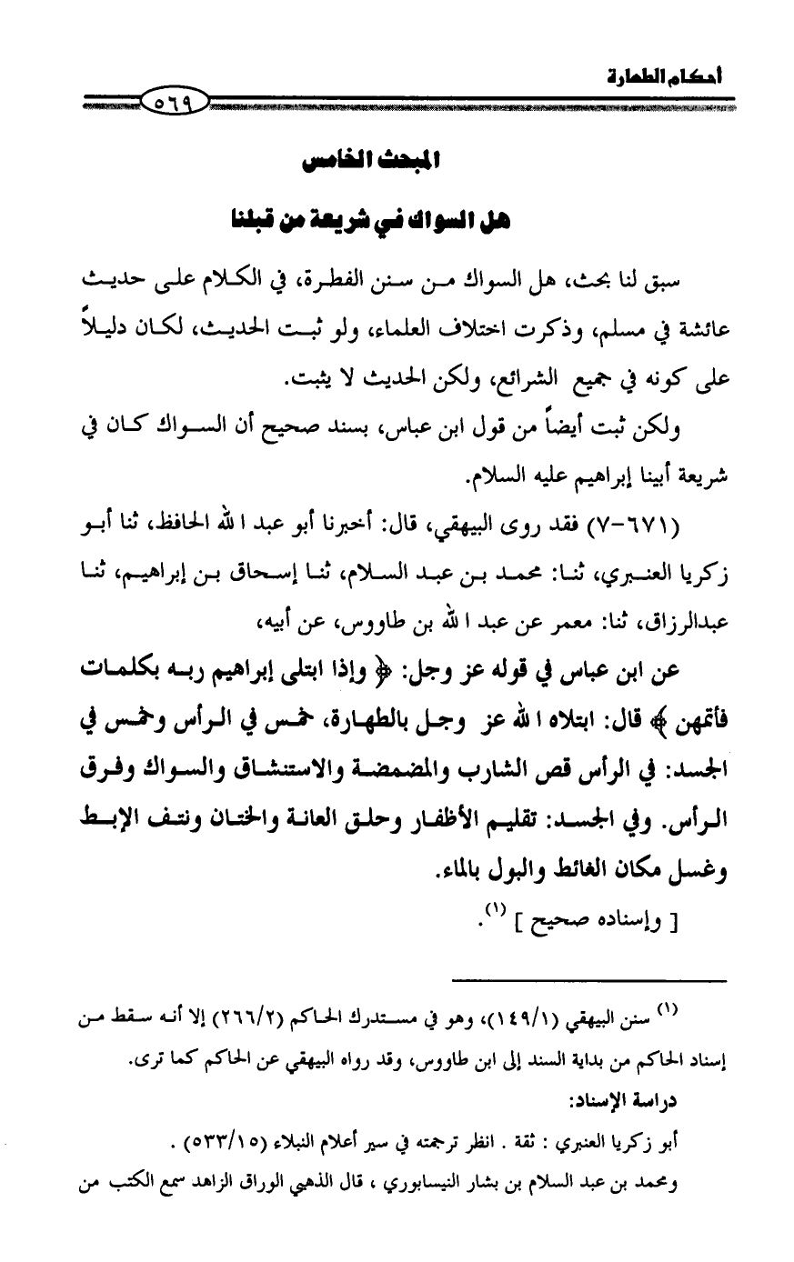 ولكن ثبت أيضاً من قول ابن عباس، بسند صحيح أن السواك كان في شريعة أبينا إبراهيم عليه السلام.