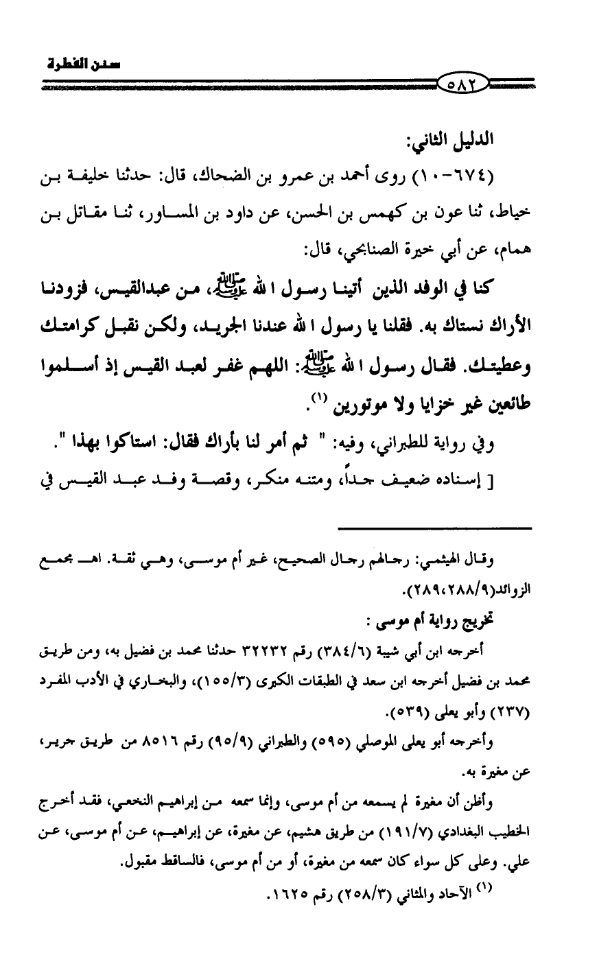 (674 - 10) روى أحمد بن عمرو بن الضحاك، قال: حدثنا خليفة بن خياط، ثنا عون بن كهمس بن الحسن، عن داود بن المساور، ثنا مقاتل بن همام، عن أبي خيرة الصنابحي، قال:
