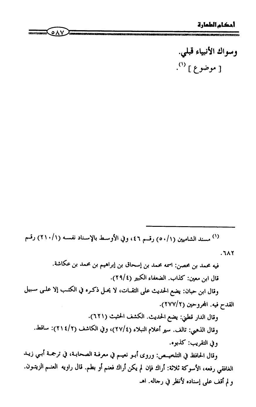وقال الحافظ في التلخيص: وروى أبو نعيم في معرفة الصحابة، في ترجمة أبي زيد الغافقي رفعه، الأسوكة ثلاثة: أراك فإن لم يكن أراك فعنم أو بطم. قال راويه العنم الزيتون. ولم أقف على إسناده لأنظر في رجاله. اهـ