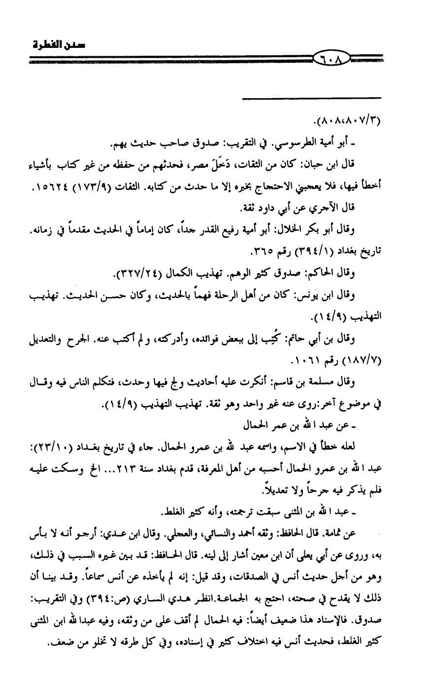 عن ثمامة. قال الحافظ: وثقه أحمد والنسائي، والعجلي. وقال ابن عدي: أرجو أنه لا بأس به، وروى عن أبي يعلى أن ابن معين أشار إلى لينه. قال الحافظ: قد بين غيره السبب في ذلك، وهو من أجل حديث أنس في الصدقات، وقد قيل: إنه لم يأخذه عن أنس سماعاً. وقد بينا أن ذلك لا يقدح في صحته، احتج به الجماعة. انظر هدي الساري (ص:394) وفي التقريب: صدوق. فالإسناد هذا ضعيف أيضاً: فيه الحمال لم أقف على من وثقه، وفيه عبد الله بن المثنى كثير الغلط، فحديث أنس فيه اختلاف كثير في إسناده، وفي كل طرقه لا تخلو من ضعف.