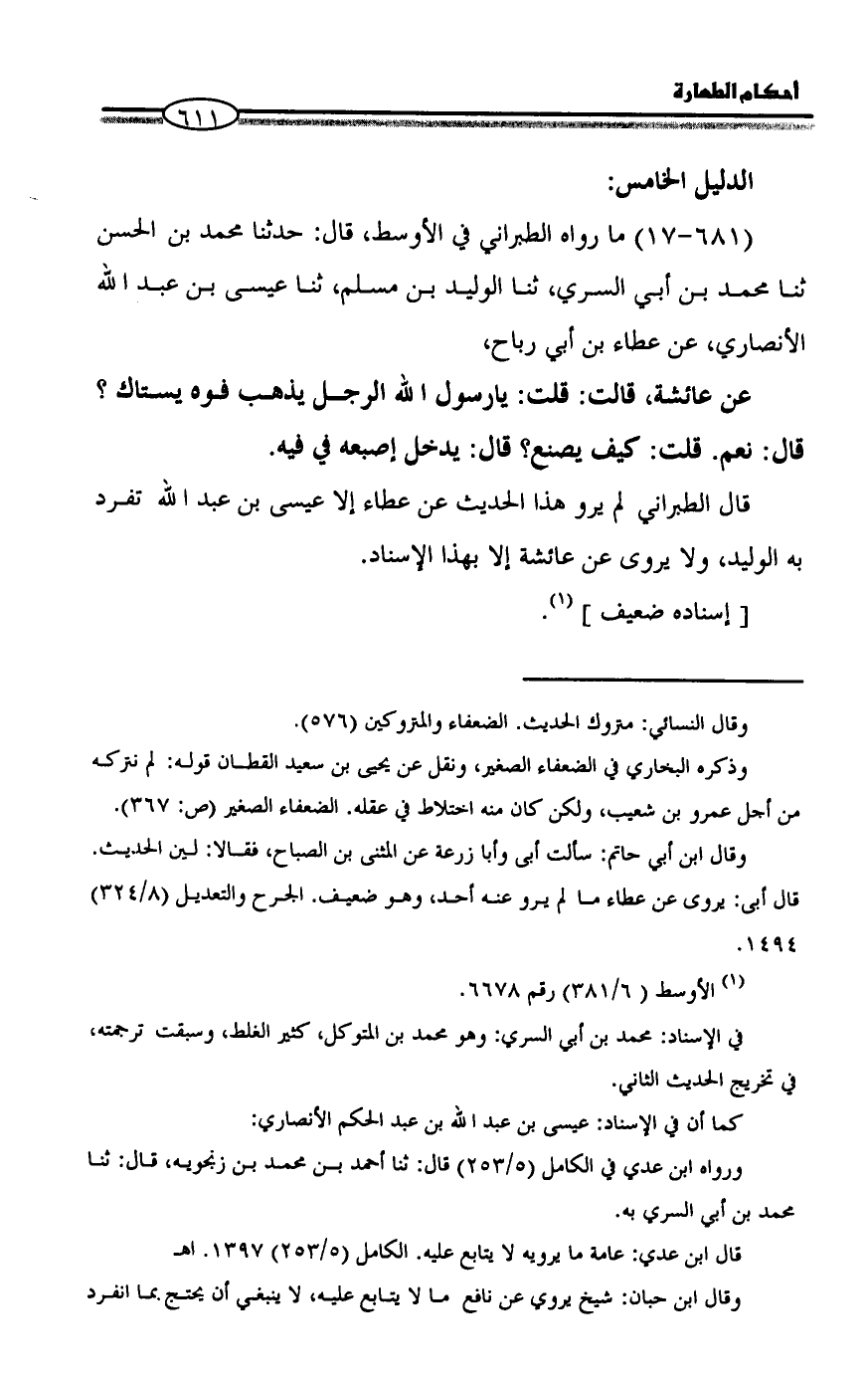 (681 - 17) ما رواه الطبراني في الأوسط، قال: حدثنا محمد بن الحسن ثنا محمد بن أبي السري، ثنا الوليد بن مسلم، ثنا عيسى بن عبد الله الأنصاري، عن عطاء بن أبي رباح،