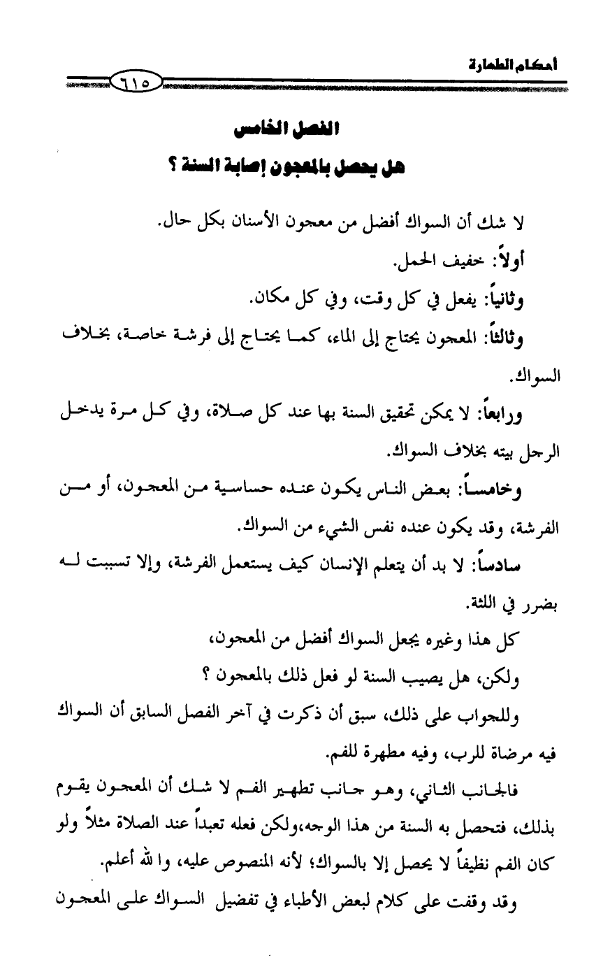 ورابعاً: لا يمكن تحقيق السنة بها عند كل صلاة، وفي كل مرة يدخل الرجل بيته بخلاف السواك.