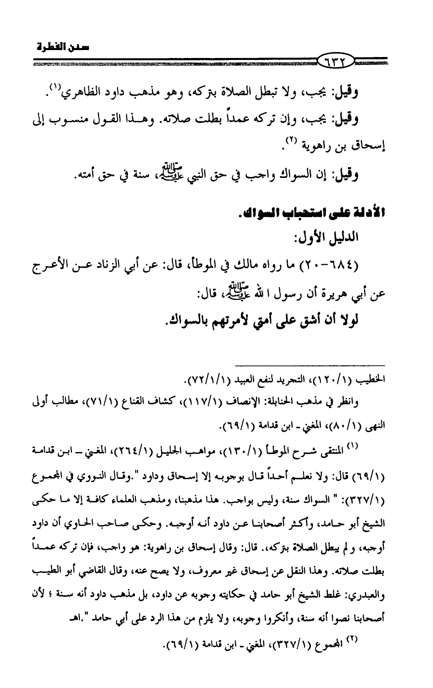 (¬1) المنتقى شرح الموطأ (1/ 130)، مواهب الجليل (1/ 264)، المغني ـ ابن قدامة (1/ 69) قال: ولا نعلم أحداً قال بوجوبه إلا إسحاق وداود ".وقال النووي في المجموع (1/ 327): " السواك سنة، وليس بواجب. هذا مذهبنا، ومذهب العلماء كافة إلا ما حكى الشيخ أبو حامد، وأكثر أصحابنا عن داود أنه أوجبه. وحكى صاحب الحاوي أن داود أوجبه، ولم يبطل الصلاة بتركه،. قال: وقال إسحاق بن راهوية: هو واجب، فإن تركه عمداً بطلت صلاته. وهذا النقل عن إسحاق غير معروف، ولا يصح عنه، وقال القاضي أبو الطيب والعبدري: غلط الشيخ أبو حامد في حكايته وجوبه عن داود، بل مذهب داود أنه سنة؛ لأن أصحابنا نصوا أنه سنة، وأنكروا وجوبه، ولا يلزم من هذا الرد على أبي حامد ". اهـ
