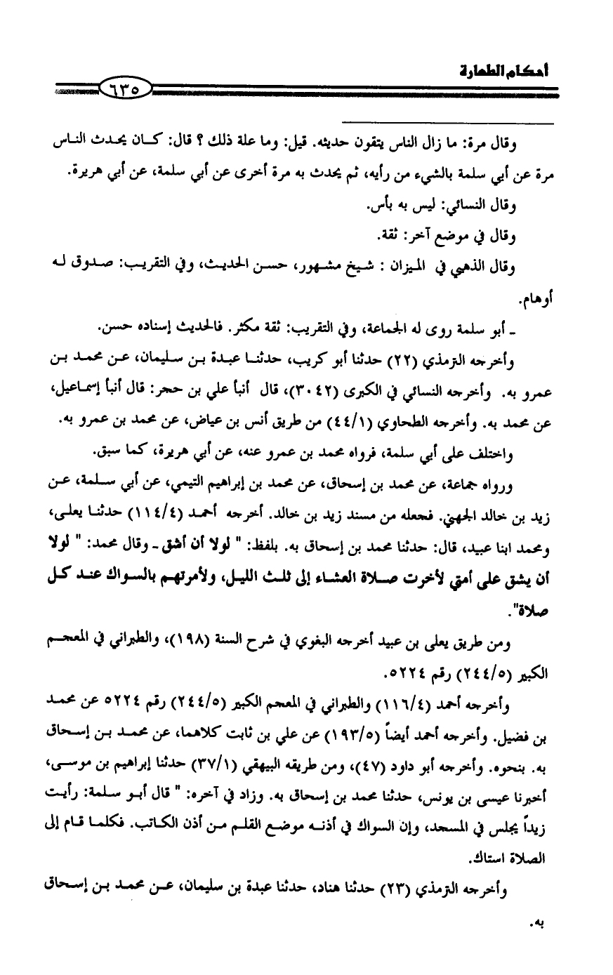 ورواه جماعة، عن محمد بن إسحاق، عن محمد بن إبراهيم التيمي، عن أبي سلمة، عن زيد بن خالد الجهني. فجعله من مسند زيد بن خالد. أخرجه أحمد (4/ 114) حدثنا يعلى، ومحمد ابنا عبيد، قال: حدثنا محمد بن إسحاق به. بلفظ: " لولا أن أشق ـ وقال محمد: " لولا أن يشق على أمتي لأخرت صلاة العشاء إلى ثلث الليل، ولأمرتهم بالسواك عند كل صلاة ".