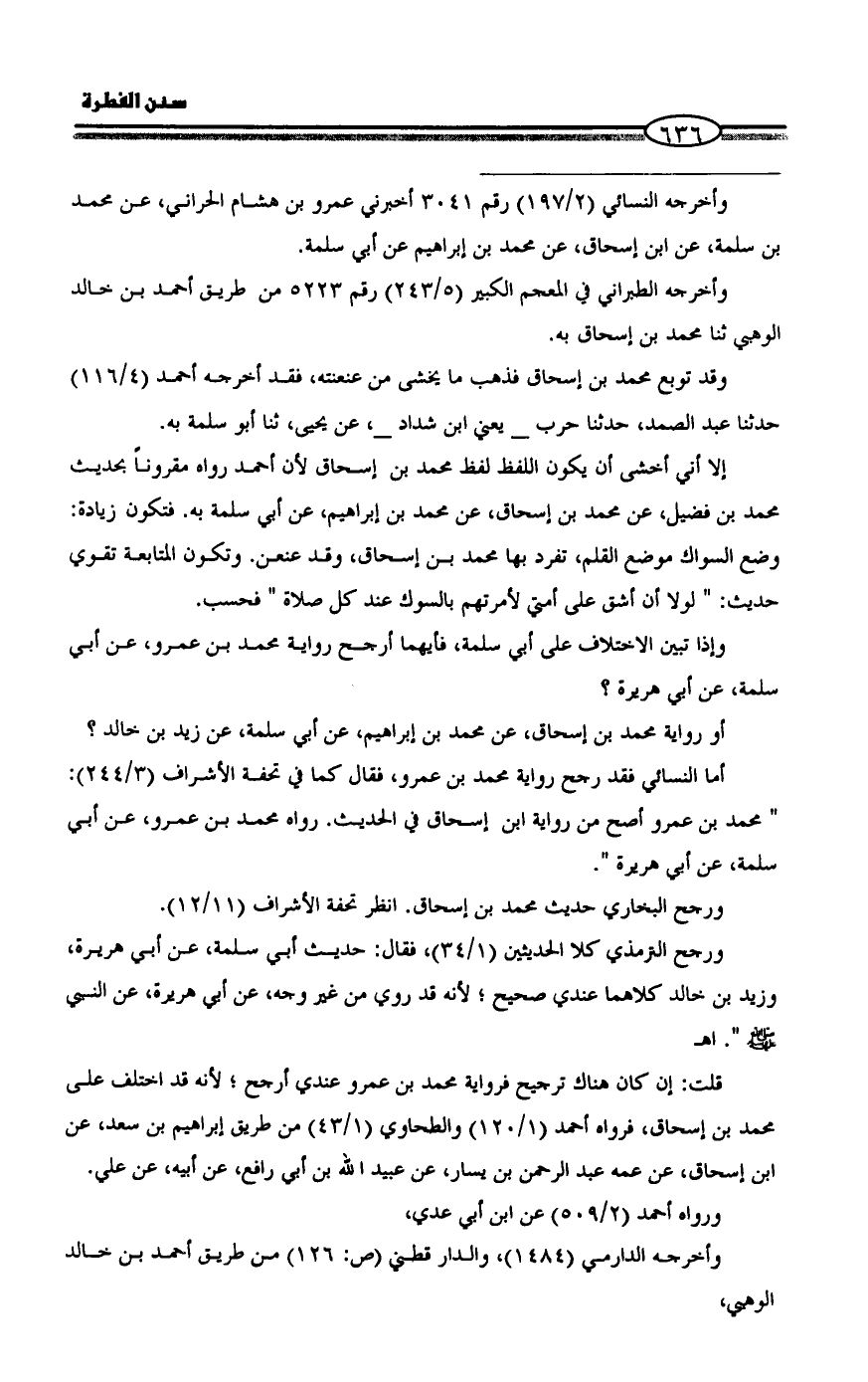 إلا أني أخشى أن يكون اللفظ لفظ محمد بن إسحاق لأن أحمد رواه مقروناً بحديث محمد بن فضيل، عن محمد بن إسحاق، عن محمد بن إبراهيم، عن أبي سلمة به. فتكون زيادة: وضع السواك موضع القلم، تفرد بها محمد بن إسحاق، وقد عنعن. وتكون المتابعة تقوي حديث: " لولا أن أشق على أمتي لأمرتهم بالسوك عند كل صلاة " فحسب.