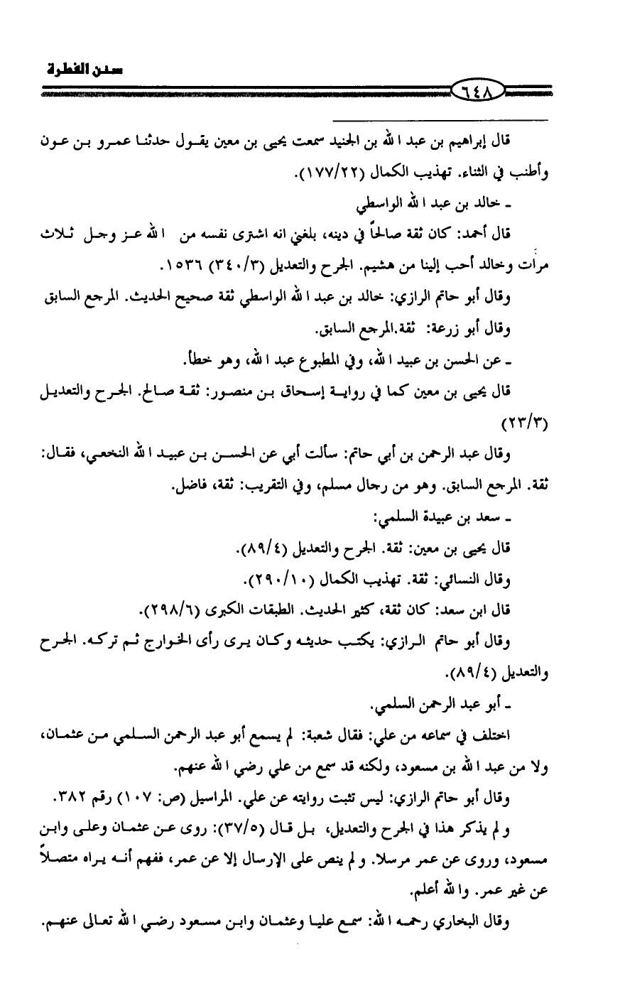 قال أحمد: كان ثقة صالحاً في دينه، بلغني انه اشترى نفسه من الله عز وجل ثلاث مرات وخالد أحب إلينا من هشيم. الجرح والتعديل (3/ 340) 1536.