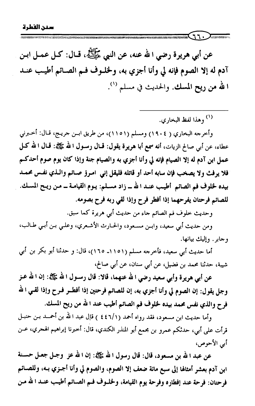 عن عبد الله بن مسعود، قال: قال رسول الله - صلى الله عليه وسلم -: إن الله عز وجل جعل حسنة ابن آدم بعشر أمثالها إلى سبع مائة ضعف إلا الصوم، والصوم لي وأنا أجزي به، وللصائم فرحتان: فرحة عند إفطاره وفرحة يوم القيامة، ولخلوف فم الصائم أطيب عند الله من =