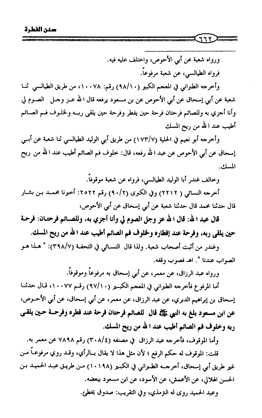 أما المرفوع فأخرجه الطبراني في المعجم الكبير (10/ 97) رقم 10077، قال حدثنا إسحاق بن إبراهيم الدبري، عن عبد الرزاق، عن معمر، عن أبي إسحاق، عن أبي الأحوص، عن ابن مسعود بلغ به النبي - صلى الله عليه وسلم - قال للصائم فرحتان فرحة عند فطره وفرحة حين يلقى ربه وخلوف فم الصائم أطيب عند الله من ريح المسك.