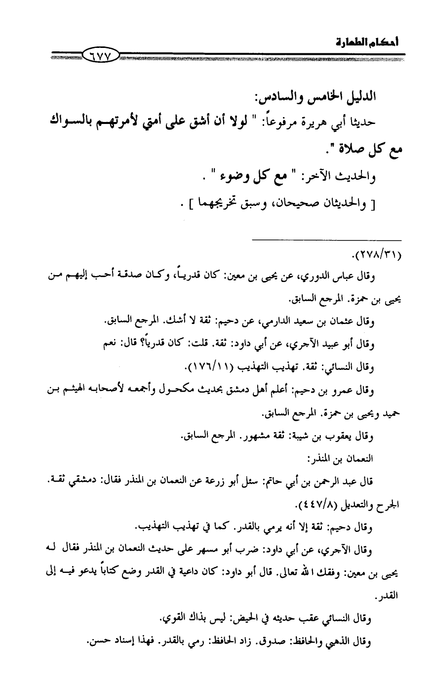 حديثا أبي هريرة مرفوعاً: " لولا أن أشق على أمتي لأمرتهم بالسواك مع كل صلاة ".