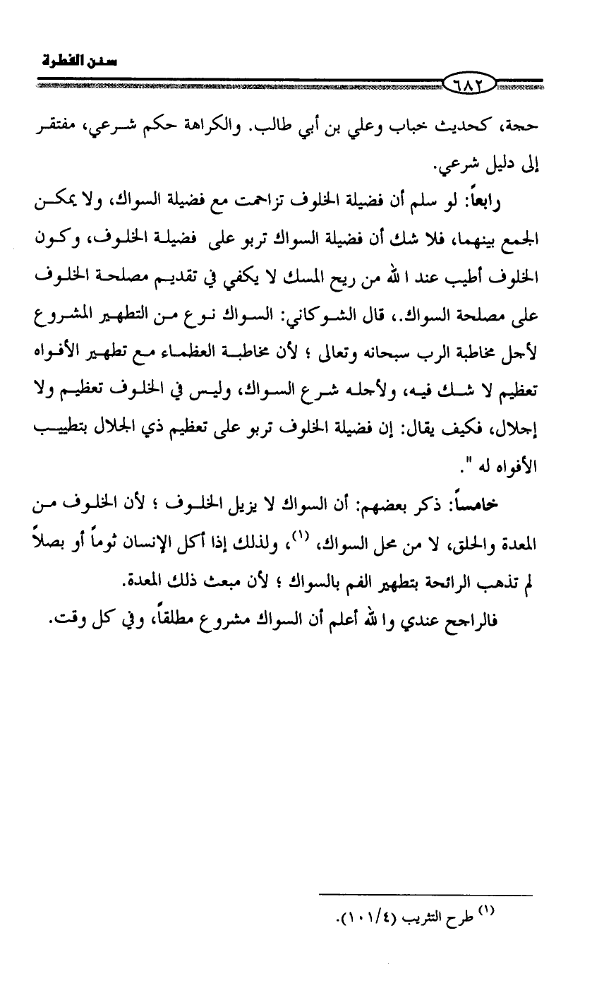 رابعاً: لو سلم أن فضيلة الخلوف تزاحمت مع فضيلة السواك، ولا يمكن الجمع بينهما، فلا شك أن فضيلة السواك تربو على فضيلة الخلوف، وكون الخلوف أطيب عند الله من ريح المسك لا يكفي في تقديم مصلحة الخلوف على مصلحة السواك.، قال الشوكاني: السواك نوع من التطهير المشروع لأجل مخاطبة الرب سبحانه وتعالى؛ لأن مخاطبة العظماء مع تطهير الأفواه تعظيم لا شك فيه، ولأجله شرع السواك، وليس في الخلوف تعظيم ولا إجلال، فكيف يقال: إن فضيلة الخلوف تربو على تعظيم ذي الجلال بتطييب الأفواه له ".