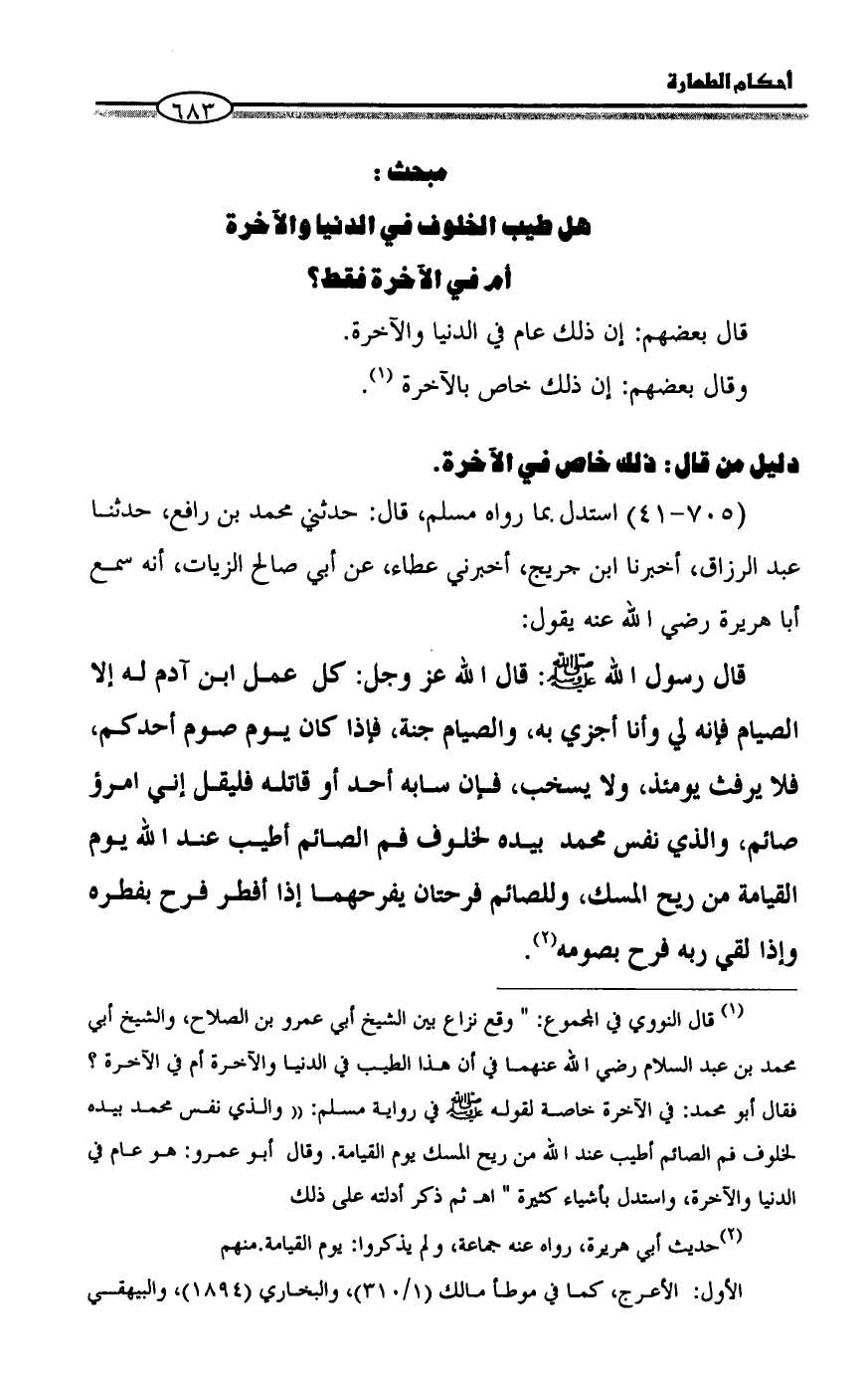 (¬1) قال النووي في المجموع: " وقع نزاع بين الشيخ أبي عمرو بن الصلاح، والشيخ أبي محمد بن عبد السلام رضي الله عنهما في أن هذا الطيب في الدنيا والآخرة أم في الآخرة؟ فقال أبو محمد: في الآخرة خاصة لقوله - صلى الله عليه وسلم - في رواية مسلم: «والذي نفس محمد بيده لخلوف فم الصائم أطيب عند الله من ريح المسك يوم القيامة. وقال أبو عمرو: هو عام في الدنيا والآخرة، واستدل بأشياء كثيرة» اهـ ثم ذكر أدلته على ذلك