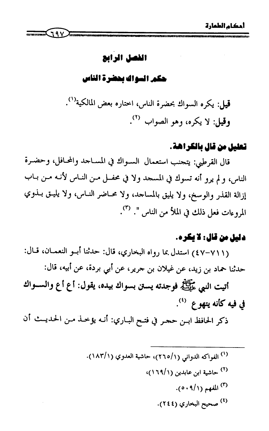 قال القرطبي: يتجنب استعمال السواك في المساجد والمحافل، وحضرة الناس، ولم يرو أنه تسوك في المسجد ولا في محفل من الناس لأنه من باب إزالة القذر والوسخ، ولا يليق بالمساجد، ولا محاضر الناس، ولا يليق بذوي المروءات فعل ذلك في الملأ من الناس ". (¬3).