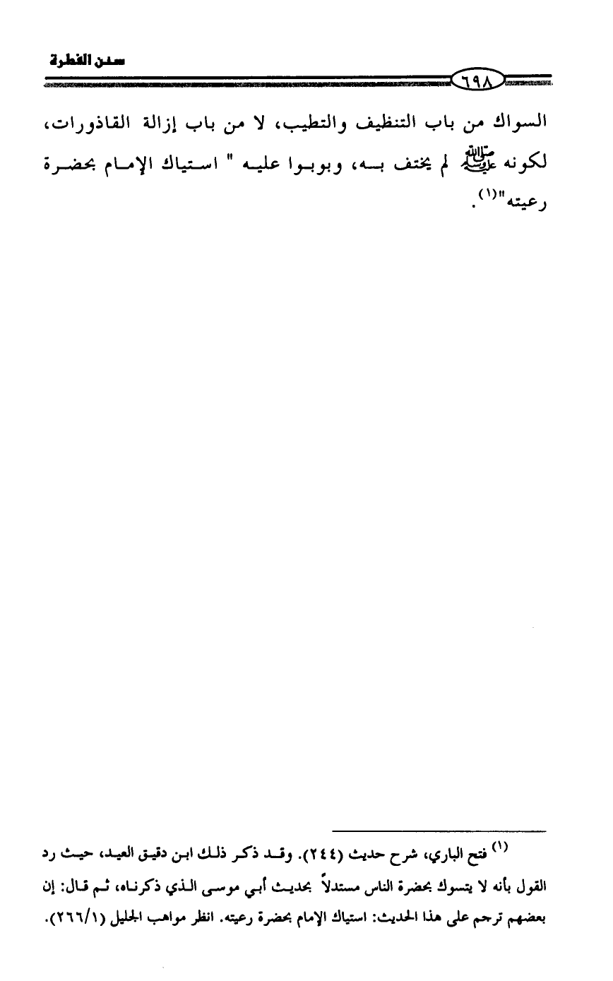 (¬1) فتح الباري، شرح حديث (244). وقد ذكر ذلك ابن دقيق العيد، حيث رد القول بأنه لا يتسوك بحضرة الناس مستدلاً بحديث أبي موسى الذي ذكرناه، ثم قال: إن بعضهم ترجم على هذا الحديث: استياك الإمام بحضرة رعيته. انظر مواهب الجليل (1/ 266).