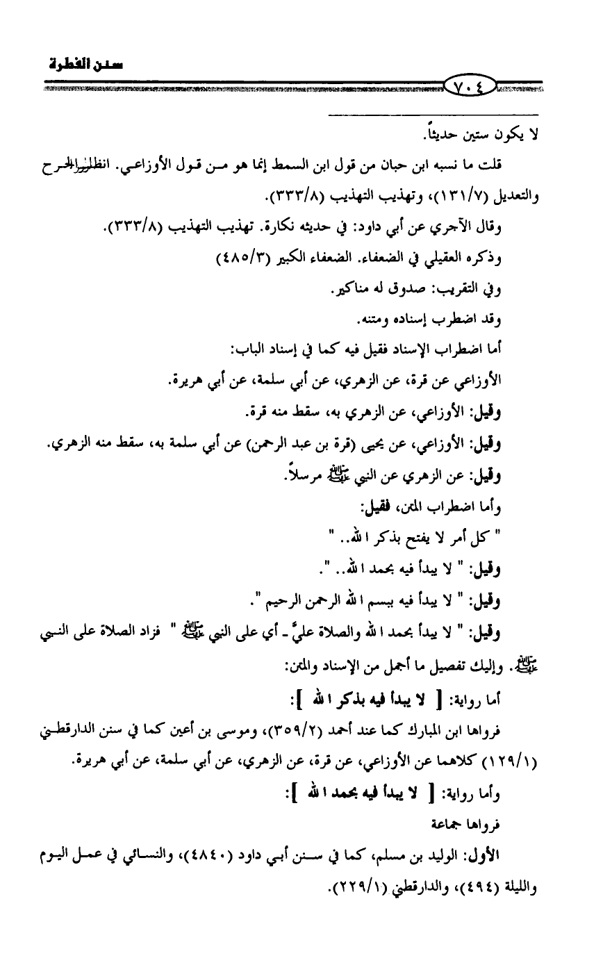وقيل: " لا يبدأ بحمد الله والصلاة عليَّ ـ أي على النبي - صلى الله عليه وسلم - " فزاد الصلاة على النبي - صلى الله عليه وسلم - ? وإليك تفصيل ما أجمل من الإسناد والمتن: