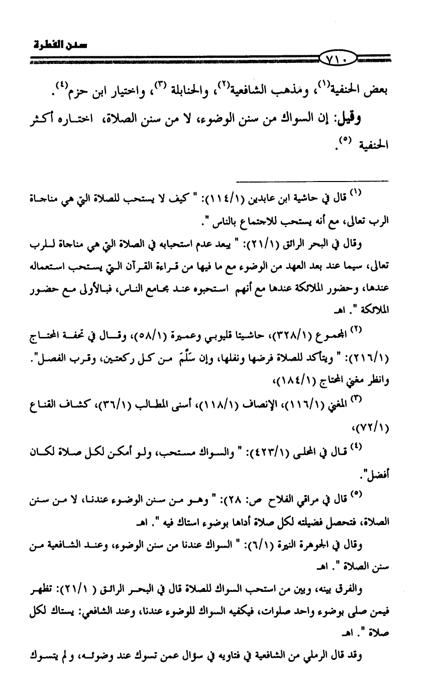 وقيل: إن السواك من سنن الوضوء، لا من سنن الصلاة، اختاره أكثر الحنفية (¬5).