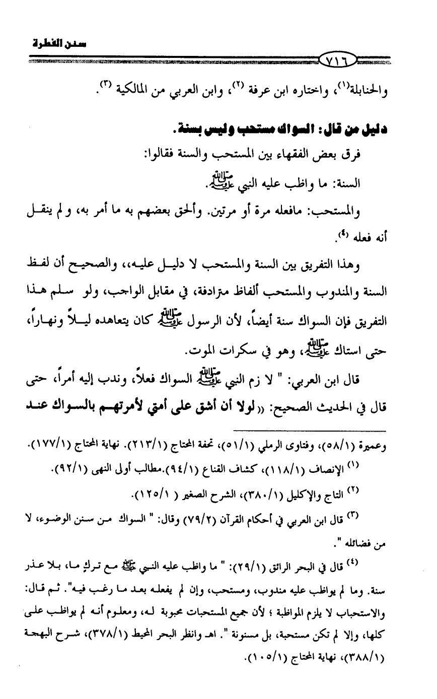 وهذا التفريق بين السنة والمستحب لا دليل عليه،، والصحيح أن لفظ السنة والمندوب والمستحب ألفاظ مترادفة، في مقابل الواجب، ولو سلم هذا التفريق فإن السواك سنة أيضاً، لأن الرسول - صلى الله عليه وسلم - كان يتعاهده ليلاً ونهاراً، حتى استاك - صلى الله عليه وسلم -، وهو في سكرات الموت.