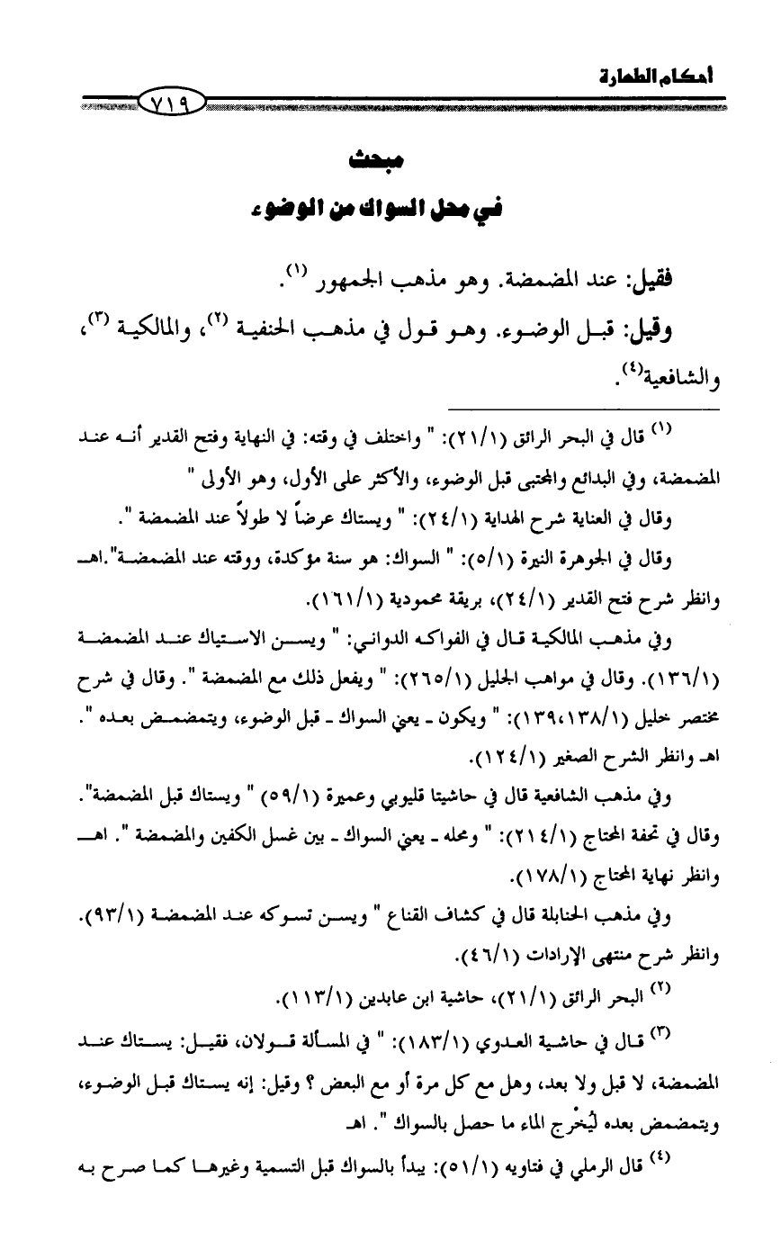 (¬3) قال في حاشية العدوي (1/ 183): " في المسألة قولان، فقيل: يستاك عند المضمضة، لا قبل ولا بعد، وهل مع كل مرة أو مع البعض؟ وقيل: إنه يستاك قبل الوضوء، ويتمضمض بعده ليُخْرج الماء ما حصل بالسواك ". اهـ