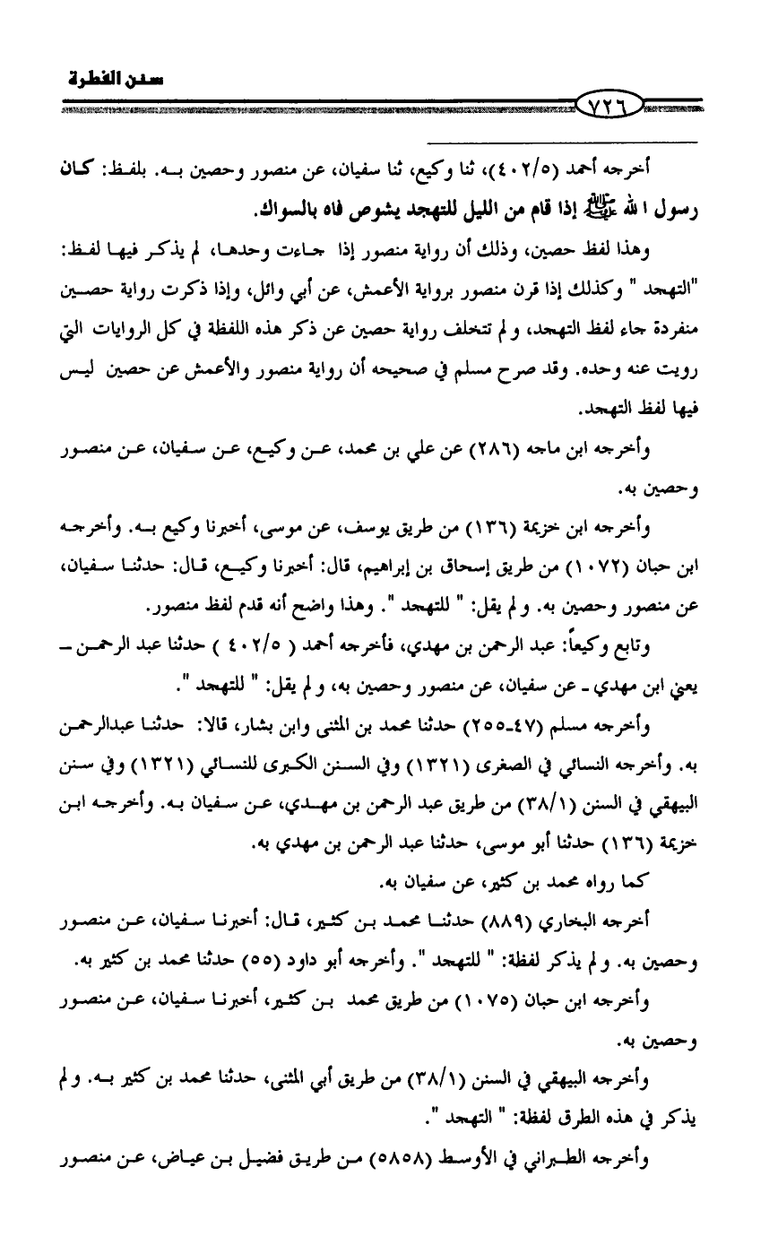 وهذا لفظ حصين، وذلك أن رواية منصور إذا جاءت وحدها، لم يذكر فيها لفظ: "التهجد " وكذلك إذا قرن منصور برواية الأعمش، عن أبي وائل، وإذا ذكرت رواية حصين منفردة جاء لفظ التهجد، ولم تتخلف رواية حصين عن ذكر هذه اللفظة في كل الروايات التي رويت عنه وحده. وقد صرح مسلم في صحيحه أن رواية منصور والأعمش عن حصين ليس فيها لفظ التهجد.