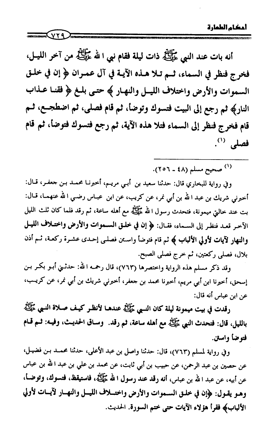 وفي رواية لمسلم (763)، قال: حدثنا واصل بن عبد الأعلى، حدثنا محمد بن فضيل، عن حصين بن عبد الرحمن، عن حبيب بن أبي ثابت، عن محمد بن علي بن عبد الله بن عباس عن أبيه، عن عبد الله بن عباس، أنه رقد عند رسول الله - صلى الله عليه وسلم -، فاستيقظ، فتسوك، وتوضأ، وهو يقول: {إن في خلق السموات والأرض واختلاف الليل والنهار لآيات لأولي الألباب} فقرأ هؤلاء الآيات حتى ختم السورة. الحديث. =