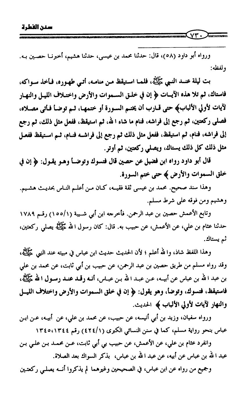 وهذا اللفظ شاذ، والله أعلم؛ لأن الحديث حديث ابن عباس في مبيته عند النبي - صلى الله عليه وسلم -، وقد رواه مسلم من طريق حصين بن عبد الرحمن، عن حبيب بن أبي ثابت، عن محمد بن علي بن عبد الله بن عباس عن أبيه، عن عبد الله بن عباس، أنه رقد عند رسول الله - صلى الله عليه وسلم -، فاستيقظ، فتسوك، وتوضأ، وهو يقول: {إن في خلق السموات والأرض واختلاف الليل والنهار لآيات لأولي الألباب} الحديث.