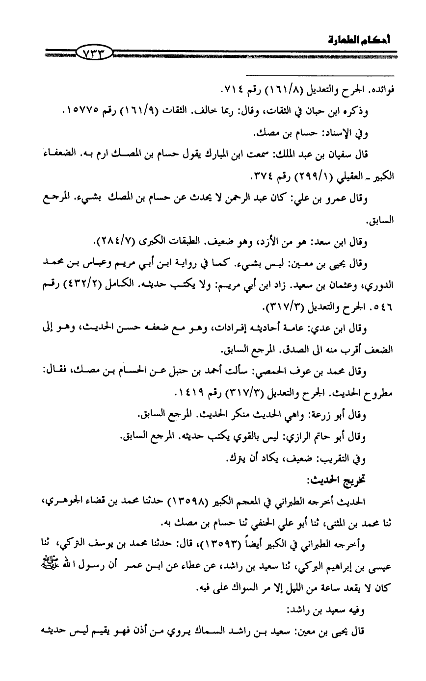 وقال عمرو بن علي: كان عبد الرحمن لا يحدث عن حسام بن المصك بشيء. المرجع السابق.