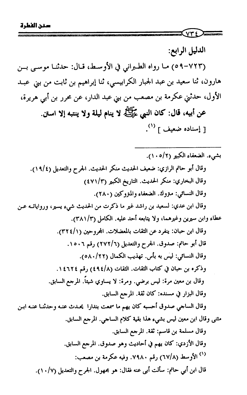 (723 - 59) ما رواه الطبراني في الأوسط، قال: حدثنا موسى بن هارون، ثنا سعيد بن عبد الجبار الكرابيسي، ثنا إبراهيم بن ثابت من بني عبد الأول، حدثني عكرمة بن مصعب من بني عبد الدار، عن محرر بن أبي هريرة،