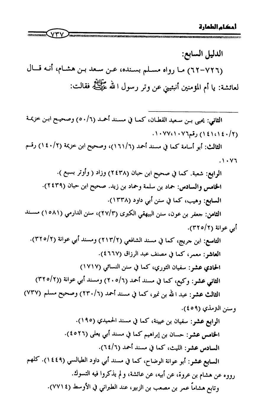 (726 - 62) ما رواه مسلم بسنده، عن سعد بن هشام، أنه قال لعائشة: يا أم المؤمنين أنبئيني عن وتر رسول الله - صلى الله عليه وسلم - فقالت