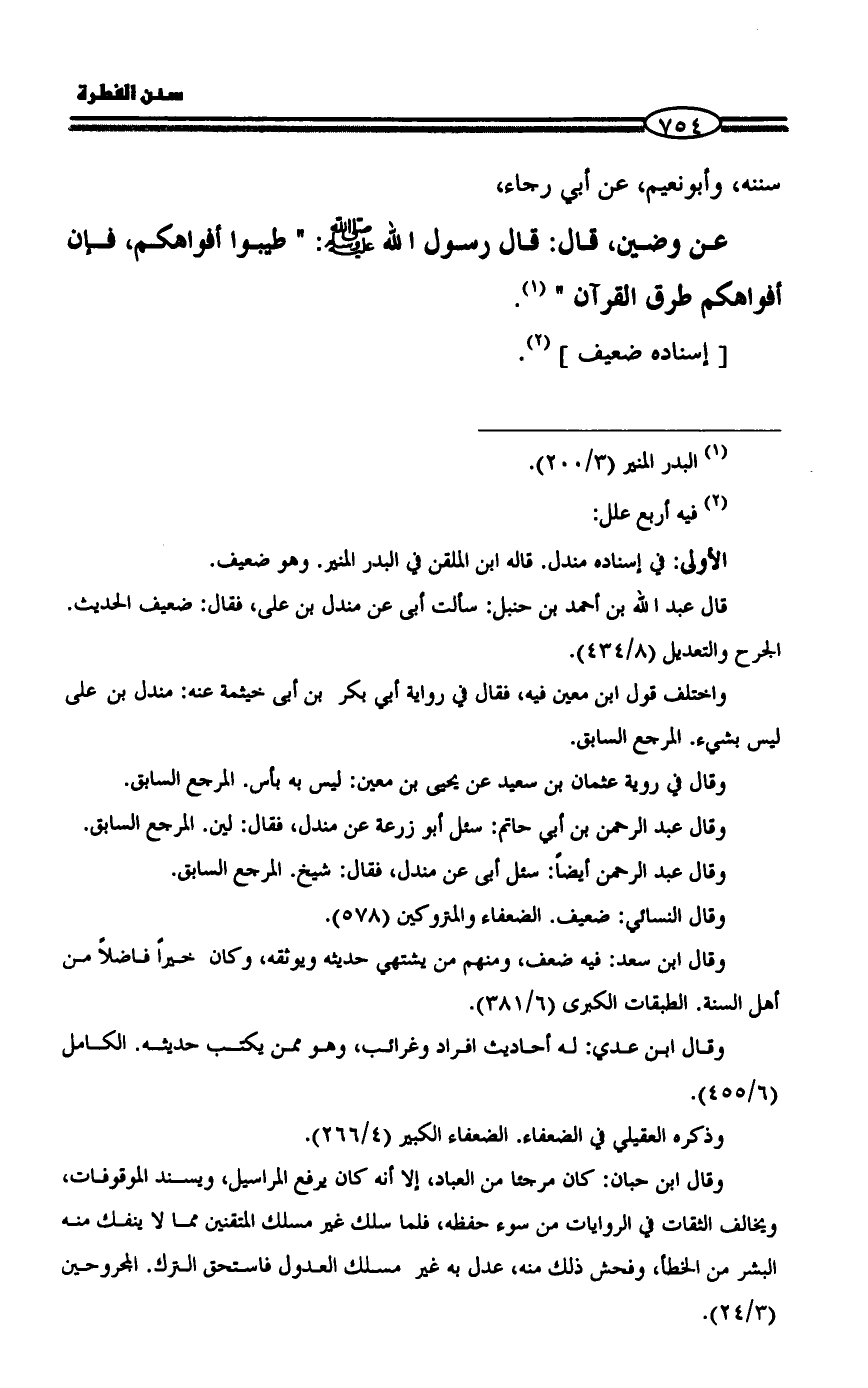 عن وضين، قال: قال رسول الله - صلى الله عليه وسلم -: " طيبوا أفواهكم، فإن أفواهكم طرق القرآن " (¬1).