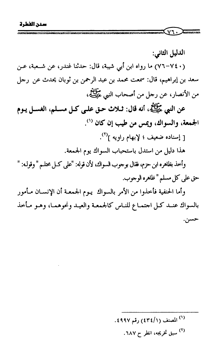 (740 - 76) ما رواه ابن أبي شيبة، قال: حدثنا غندر، عن شعبة، عن سعد بن إبراهيم، قال: سمعت محمد بن عبد الرحمن بن ثوبان يحدث عن رجل من الأنصار، عن رجل من أصحاب النبي - صلى الله عليه وسلم -،