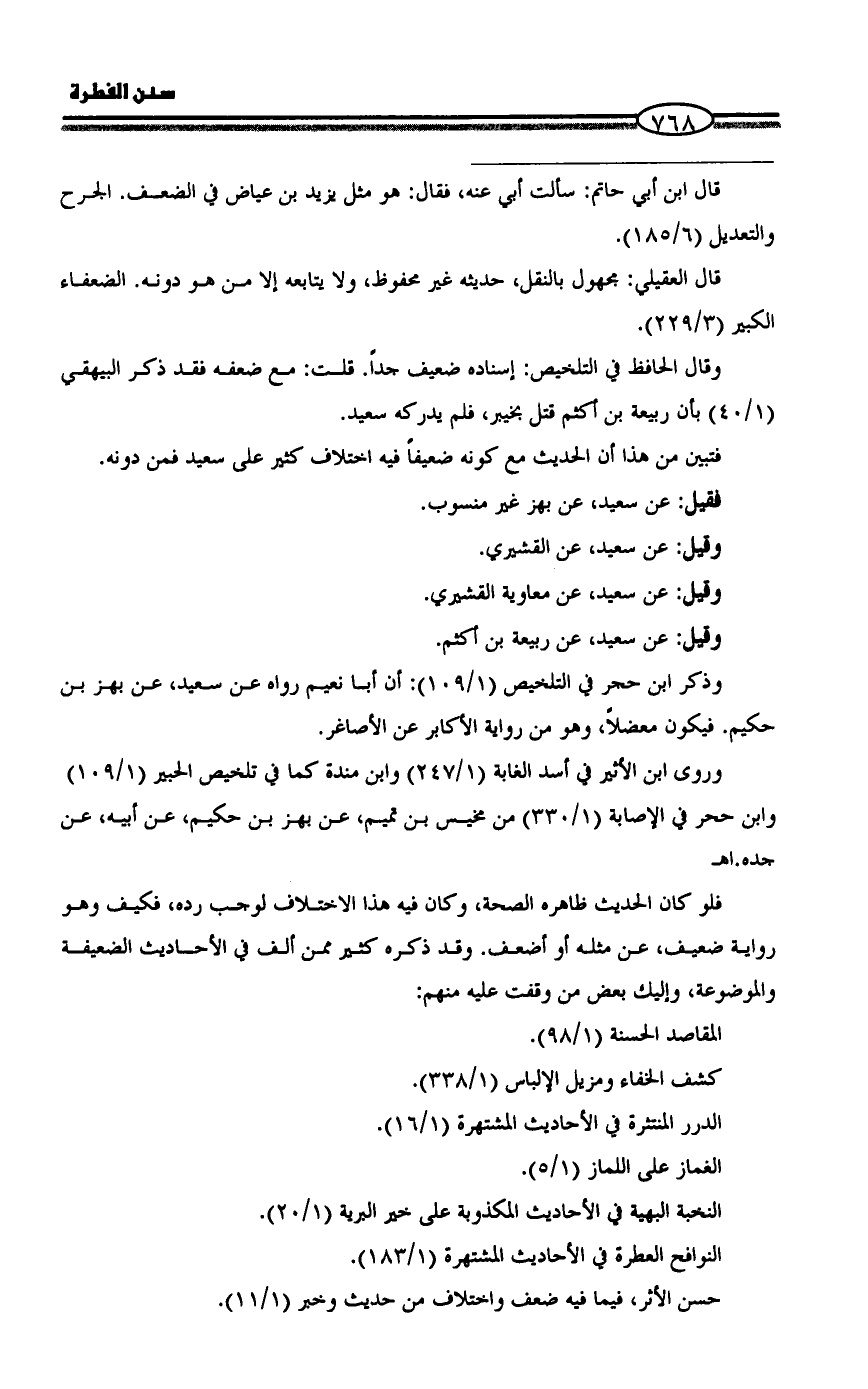 وقال الحافظ في التلخيص: إسناده ضعيف جداً. قلت: مع ضعفه فقد ذكر البيهقي (1/ 40) بأن ربيعة بن أكثم قتل بخيبر، فلم يدركه سعيد.