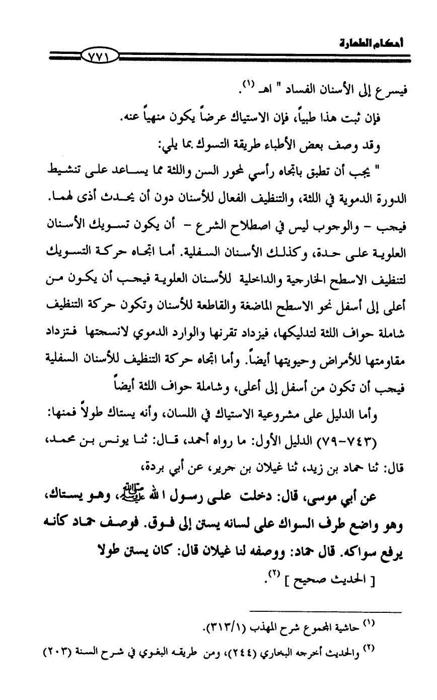 عن أبي موسى، قال: دخلت على رسول الله - صلى الله عليه وسلم -، وهو يستاك، وهو واضع طرف السواك على لسانه يستن إلى فوق. فوصف حماد كأنه يرفع سواكه. قال حماد: ووصفه لنا غيلان قال: كان يستن طولا