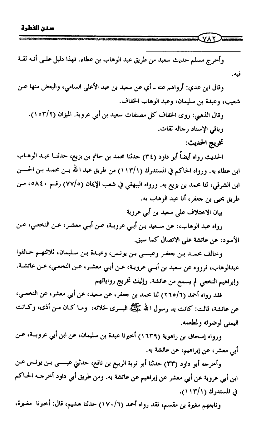 وخالف محمد بن جعفر وعيسى بن يونس، وعبدة بن سليمان، ثلاثتهم خالفوا عبد الوهاب، فرووه عن سعيد بن أبي عروبة، عن أبي معشر، عن النخعي، عن عائشة. وإبراهيم النخعي لم يسمع من عائشة. وإليك تخريج رواياتهم