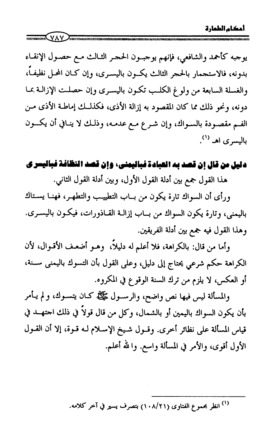 والمسألة ليس فيها نص واضح، والرسول - صلى الله عليه وسلم - كان يتسوك، ولم يأمر بأن يكون السواك باليمين أو بالشمال، وكل من قال قولاً في ذلك اجتهد في قياس المسألة على نظائر أخرى. وقول شيخ الإسلام له قوة، إلا أن القول الأول أقوى، والأمر في المسألة واسع. والله أعلم.