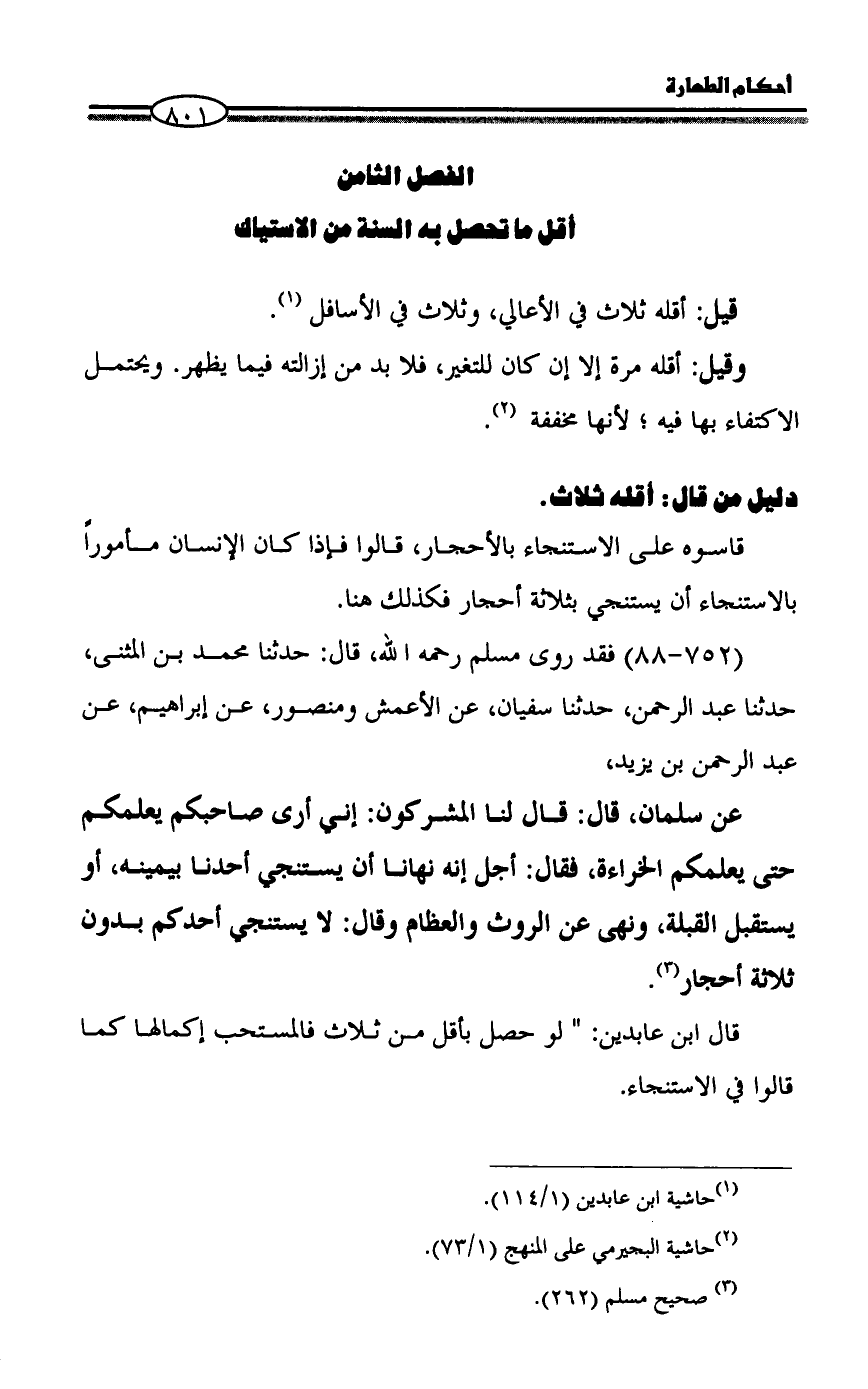 عن سلمان، قال: قال لنا المشركون: إني أرى صاحبكم يعلمكم حتى يعلمكم الخراءة، فقال: أجل إنه نهانا أن يستنجي أحدنا بيمينه، أو يستقبل القبلة، ونهى عن الروث والعظام وقال: لا يستنجي أحدكم بدون ثلاثة أحجار (¬3).