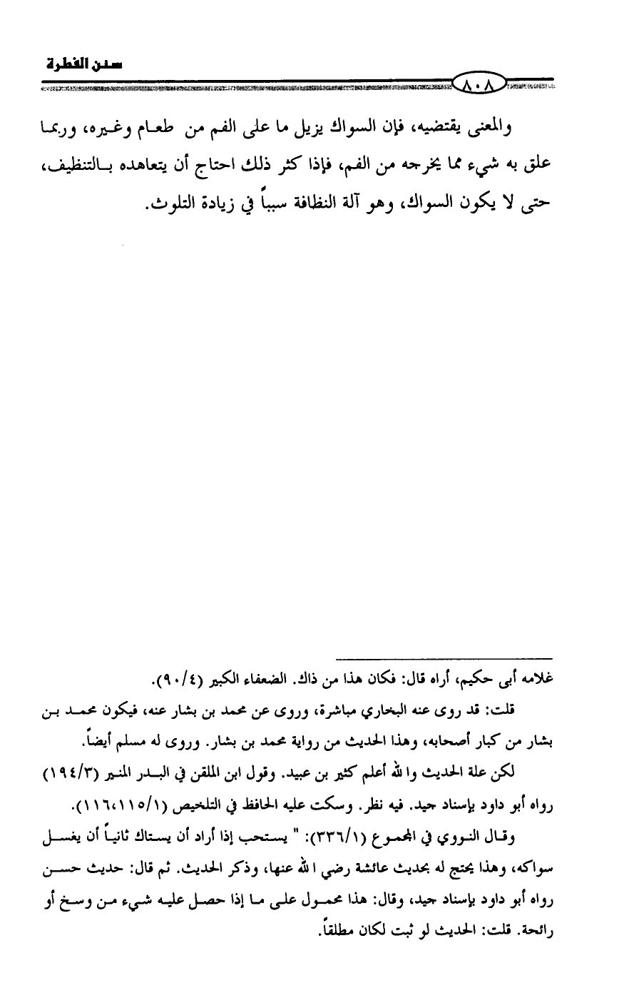 وقال النووي في المجموع (1/ 336): " يستحب إذا أراد أن يستاك ثانياً أن يغسل سواكه، وهذا يحتج له بحديث عائشة رضي الله عنها، وذكر الحديث. ثم قال: حديث حسن رواه أبو داود بإسناد جيد، وقال: هذا محمول على ما إذا حصل عليه شيء من وسخ أو رائحة. قلت: الحديث لو ثبت لكان مطلقاً.