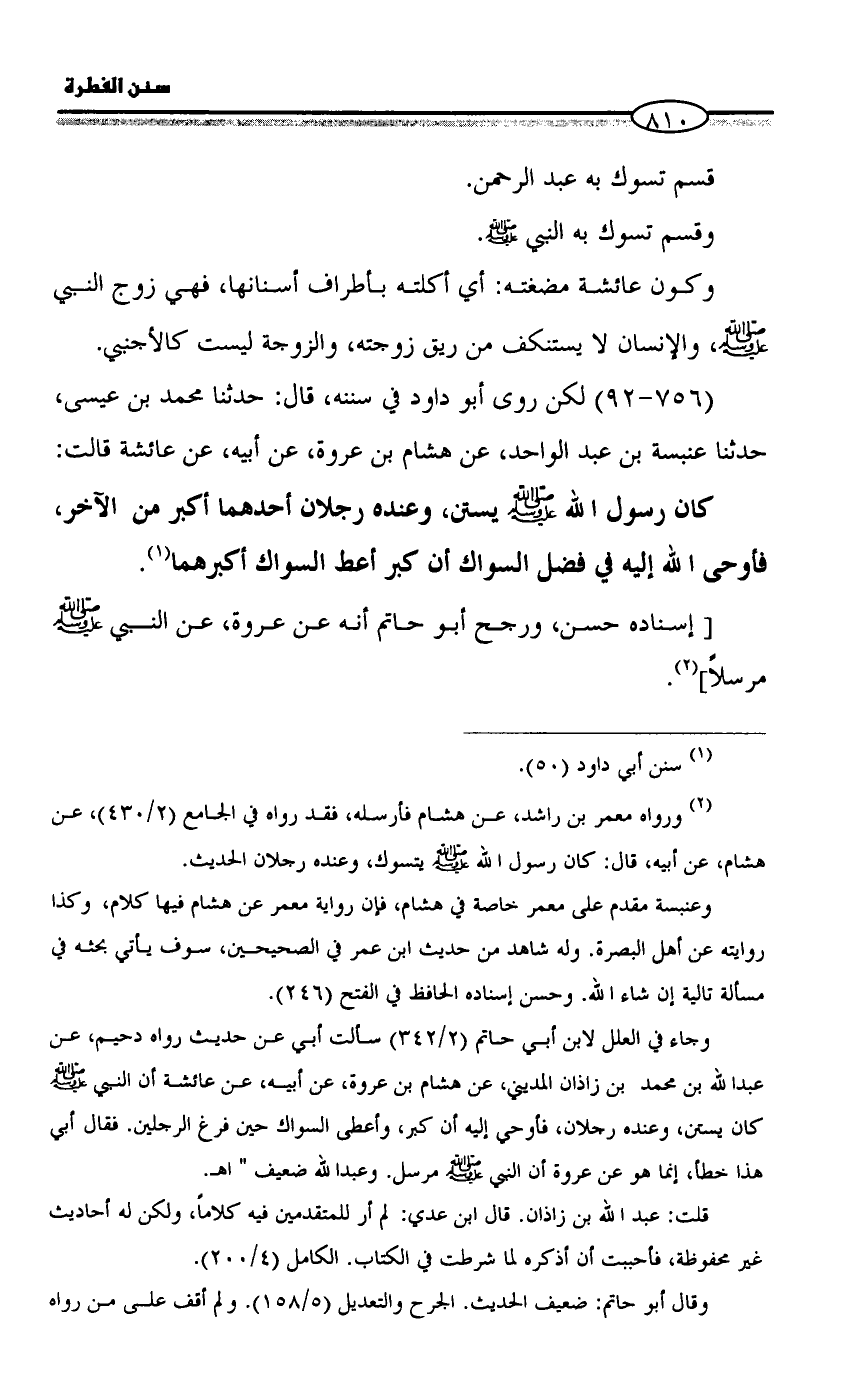 وجاء في العلل لابن أبي حاتم (2/ 342) سألت أبي عن حديث رواه دحيم، عن عبد الله بن محمد بن زاذان المديني، عن هشام بن عروة، عن أبيه، عن عائشة أن النبي - صلى الله عليه وسلم - كان يستن، وعنده رجلان، فأوحي إليه أن كبر، وأعطى السواك حين فرغ الرجلين. فقال أبي هذا خطأ، إنما هو عن عروة أن النبي - صلى الله عليه وسلم - مرسل. وعبد الله ضعيف " اهـ.
