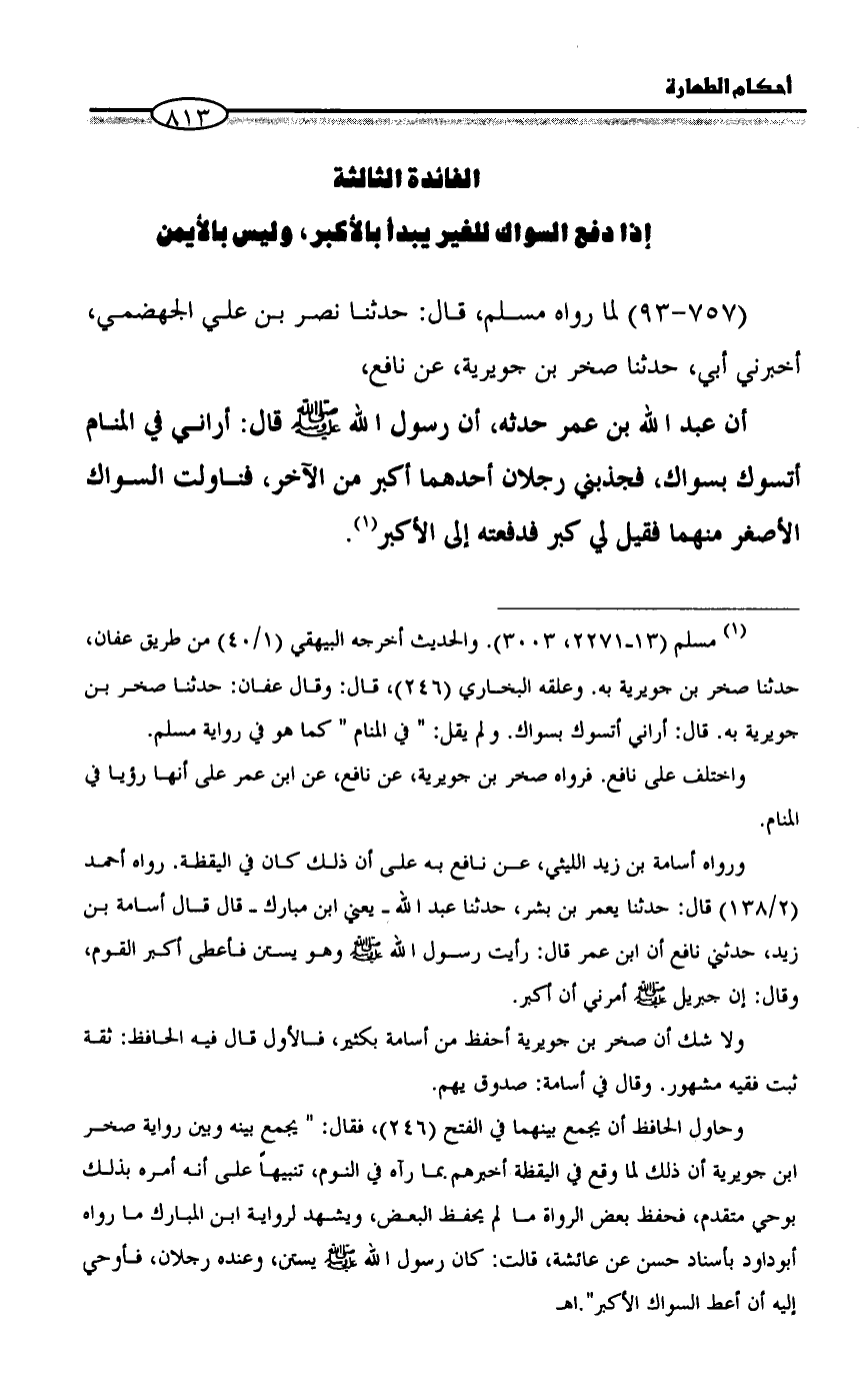 أن عبد الله بن عمر حدثه، أن رسول الله - صلى الله عليه وسلم - قال: أراني في المنام أتسوك بسواك، فجذبني رجلان أحدهما أكبر من الآخر، فناولت السواك الأصغر منهما فقيل لي كبر فدفعته إلى الأكبر (¬1).