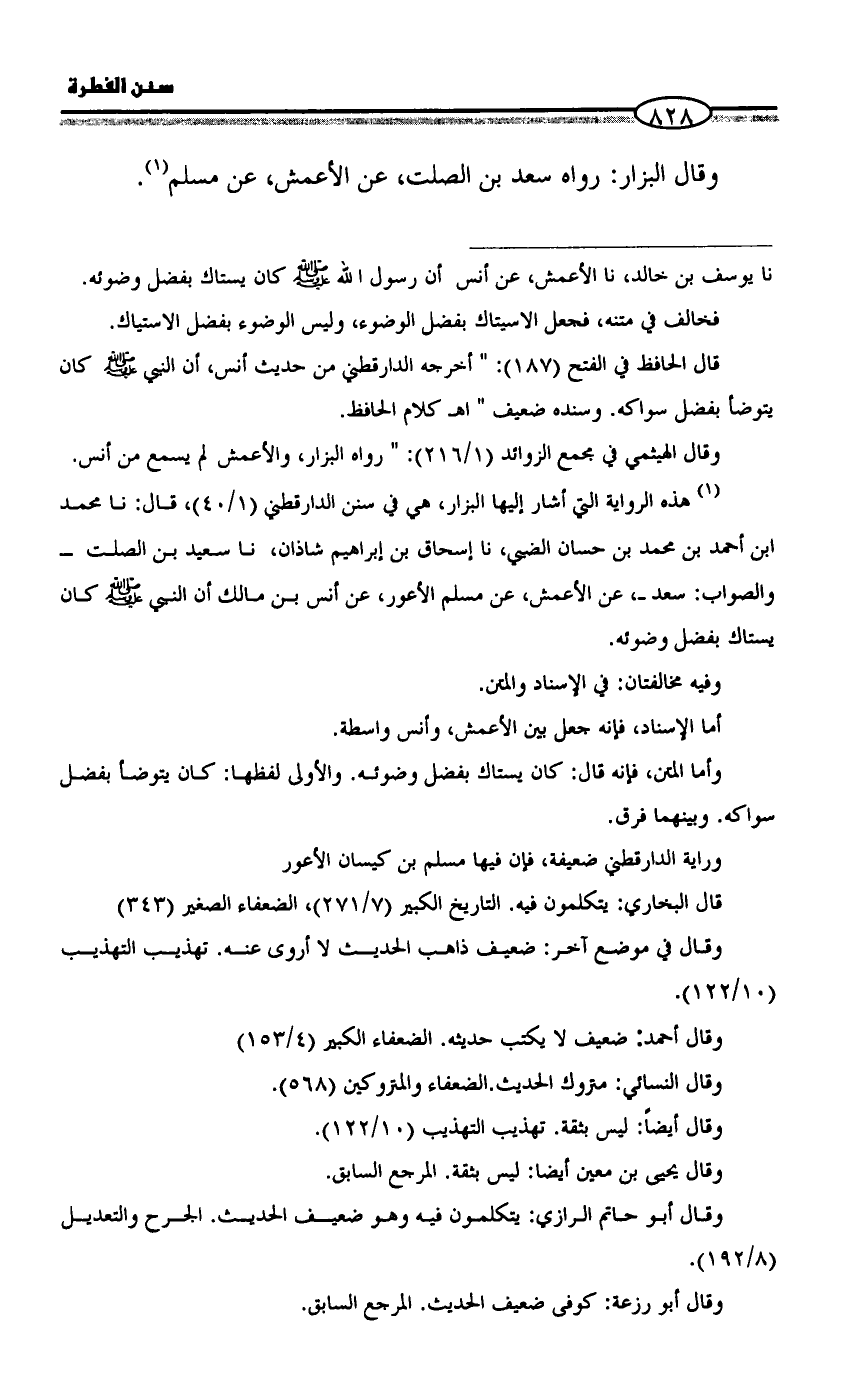 (¬1) هذه الرواية التي أشار إليها البزار، هي في سنن الدارقطني (1/ 40)، قال: نا محمد بن أحمد بن محمد بن حسان الضبي، نا إسحاق بن إبراهيم شاذان، نا سعيد بن الصلت ـ والصواب: سعد ـ، عن الأعمش، عن مسلم الأعور، عن أنس بن مالك أن النبي - صلى الله عليه وسلم - كان يستاك بفضل وضوئه.
