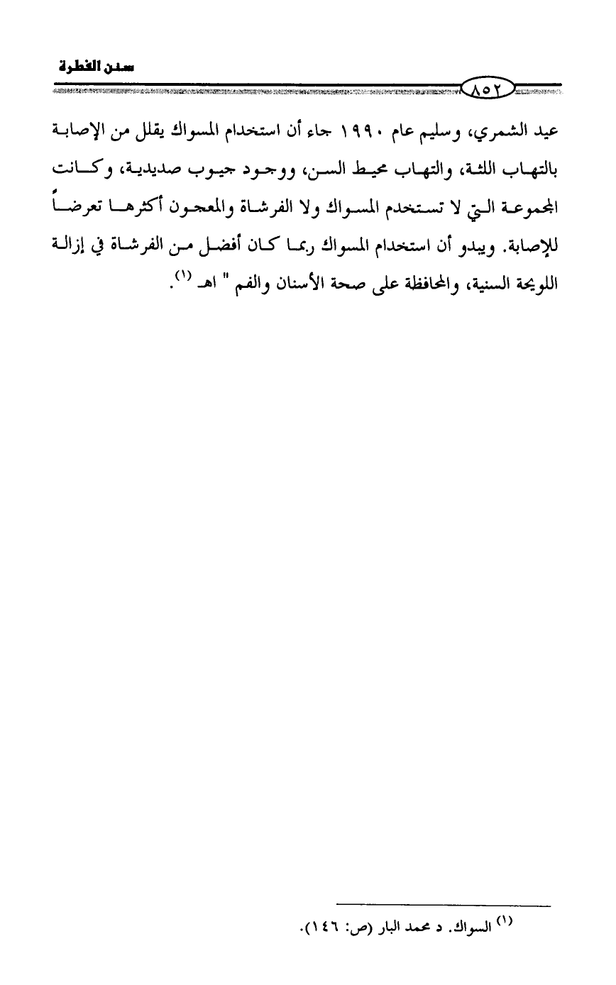 عيد الشمري، وسليم عام 1990 جاء أن استخدام المسواك يقلل من الإصابة بالتهاب اللثة، والتهاب محيط السن، ووجود جيوب صديدية، وكانت المجموعة التي لا تستخدم المسواك ولا الفرشاة والمعجون أكثرها تعرضاً للإصابة. ويبدو أن استخدام المسواك ربما كان أفضل من الفرشاة في إزالة اللويحة السنية، والمحافظة على صحة الأسنان والفم " اهـ (¬1).