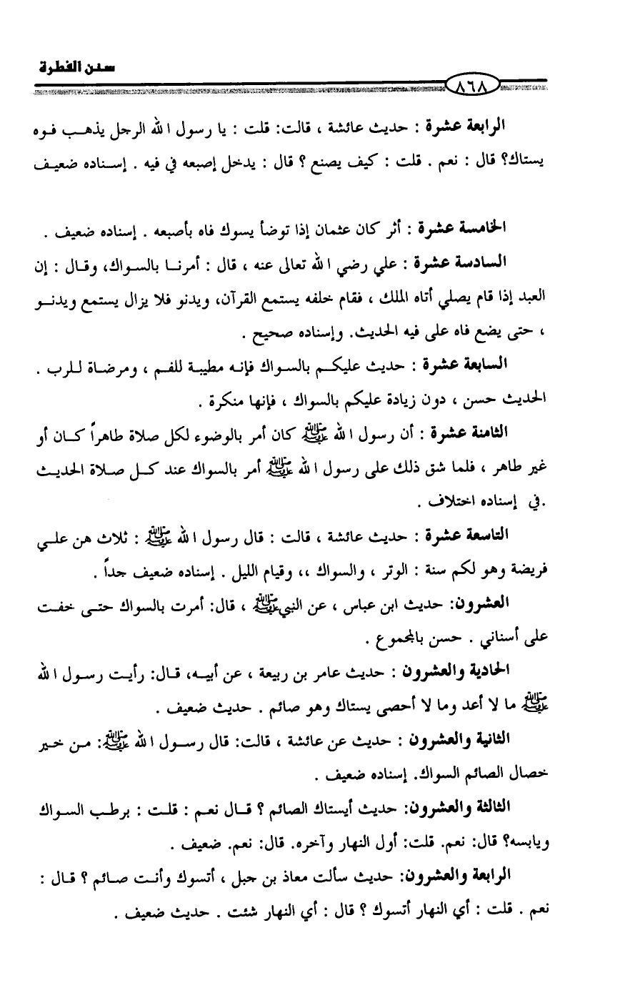 الرابعة عشرة: حديث عائشة، قالت: قلت: يا رسول الله الرجل يذهب فوه يستاك؟ قال: نعم. قلت: كيف يصنع؟ قال: يدخل إصبعه في فيه. إسناده ضعيف.