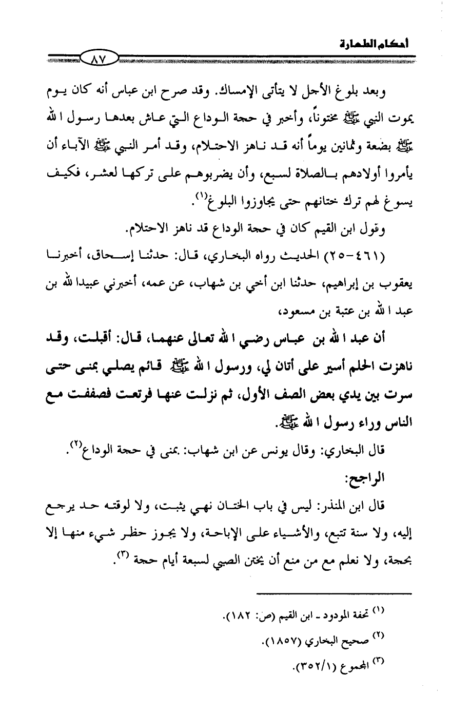 وبعد بلوغ الأجل لا يتأتى الإمساك. وقد صرح ابن عباس أنه كان يوم يموت النبي - صلى الله عليه وسلم - مختوناً، وأخبر في حجة الوداع التي عاش بعدها رسول الله - صلى الله عليه وسلم - بضعة وثمانين يوماً أنه قد ناهز الاحتلام، وقد أمر النبي - صلى الله عليه وسلم - الآباء أن يأمروا أولادهم بالصلاة لسبع، وأن يضربوهم على تركها لعشر، فكيف يسوغ لهم ترك ختانهم حتى يجاوزوا البلوغ (¬١).