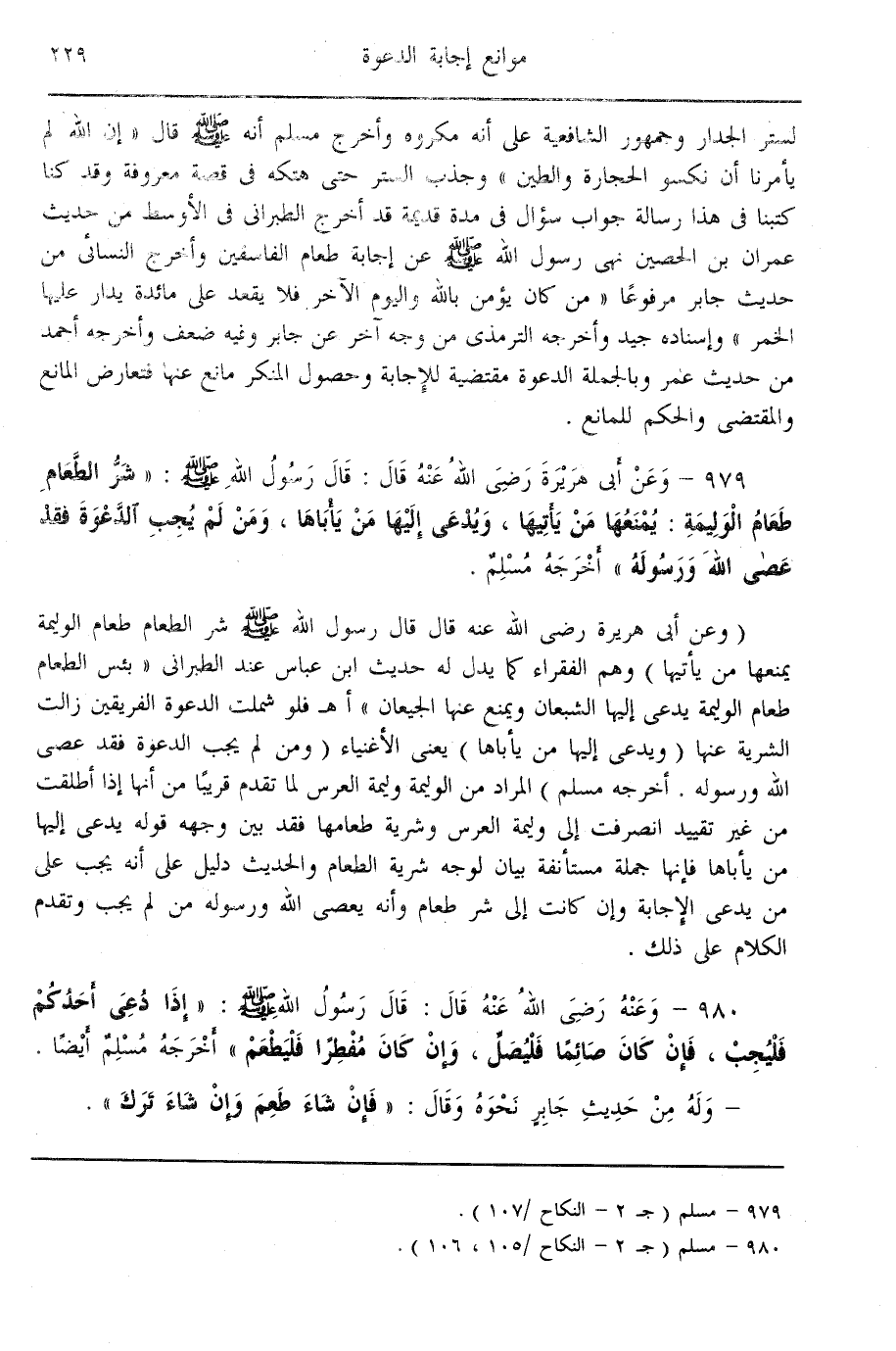 (979) وَعَنْ أَبِي هُرَيْرَةَ - رَضِيَ اللَّهُ عَنْهُ - قَالَ: قَالَ رَسُولُ اللَّهِ - صَلَّى اللَّهُ عَلَيْهِ وَسَلَّمَ -: «شَرُّ الطَّعَامِ طَعَامُ الْوَلِيمَةِ: يُمْنَعُهَا مَنْ يَأْتِيهَا، وَيُدْعَى إلَيْهَا مَنْ يَأْبَاهَا، وَمَنْ لَمْ يُجِبْ الدَّعْوَةَ فَقَدْ عَصَى اللَّهَ وَرَسُولَهُ» وَأَخْرَجَهُ مُسْلِمٌ (وَعَنْ أَبِي هُرَيْرَةَ - رَضِيَ اللَّهُ عَنْهُ - قَالَ: قَالَ رَسُولُ اللَّهِ - صَلَّى اللَّهُ عَلَيْهِ وَسَلَّمَ - «شَرُّ الطَّعَامِ طَعَامُ الْوَلِيمَةِ يُمْنَعُهَا مَنْ يَأْتِيهَا»