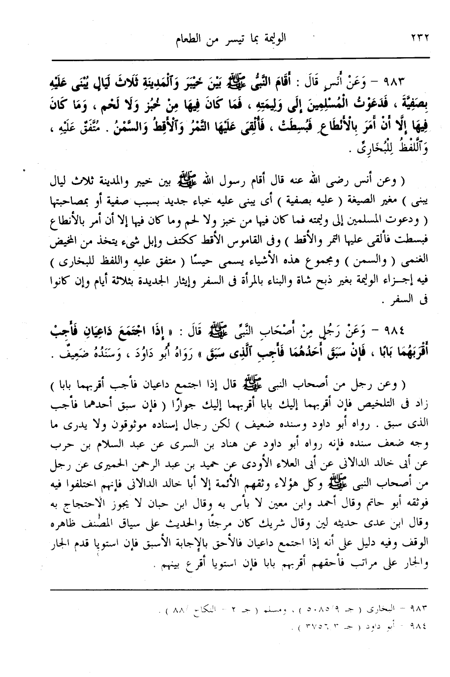 (983) - وَعَنْ أَنَسٍ قَالَ: «أَقَامَ النَّبِيُّ - صَلَّى اللَّهُ عَلَيْهِ وَسَلَّمَ - بَيْنَ خَيْبَرَ، وَالْمَدِينَةِ ثَلَاثَ لَيَالٍ يُبْنَى عَلَيْهِ بِصَفِيَّةَ، فَدَعَوْتُ الْمُسْلِمِينَ إلَى وَلِيمَتِهِ، فَمَا كَانَ فِيهَا مِنْ خُبْزٍ وَلَا لَحْمٍ، وَمَا كَانَ فِيهَا إلَّا أَنْ أَمَرَ بِالْأَنْطَاعِ فَبُسِطَتْ، فَأُلْقِي عَلَيْهَا التَّمْرُ وَالْأَقِطُ وَالسَّمْنُ»