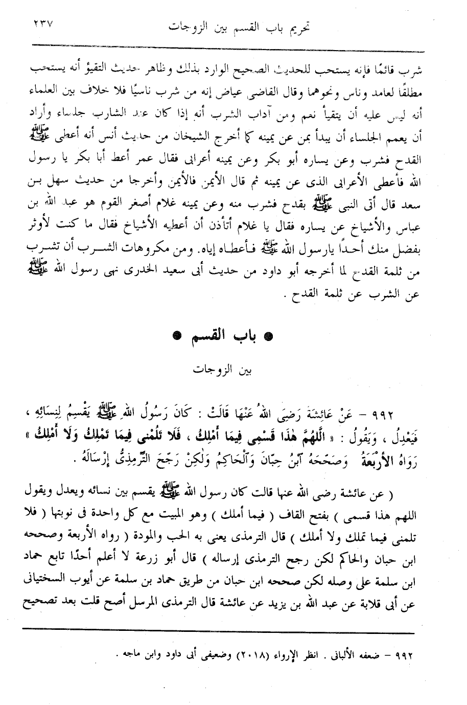 (عَنْ عَائِشَةَ - رَضِيَ اللَّهُ عَنْهَا - قَالَتْ «كَانَ رَسُولُ اللَّهِ - صَلَّى اللَّهُ عَلَيْهِ وَسَلَّمَ - يَقْسِمُ بَيْنَ نِسَائِهِ، وَيَعْدِلُ وَيَقُولُ اللَّهُمَّ هَذَا قَسْمِي» بِفَتْحِ الْقَافِ «فِيمَا أَمْلِكُ» وَهُوَ الْمَبِيتُ مَعَ كُلِّ وَاحِدَةٍ فِي نَوْبَتِهَا ( «فَلَا تَلُمْنِي فِيمَا تَمْلِكُ، وَلَا أَمْلِكُ» قَالَ التِّرْمِذِيُّ يَعْنِي بِهِ الْحُبَّ وَالْمَوَدَّةَ (رَوَاهُ الْأَرْبَعَةُ، وَصَحَّحَهُ ابْنُ حِبَّانَ، وَالْحَاكِمُ لَكِنْ رَجَحَ التِّرْمِذِيُّ إرْسَالَهُ) قَالَ أَبُو زُرْعَةَ لَا أَعْلَمُ أَحَدًا تَابَعَ حَمَّادَ بْنَ سَلَمَةَ عَلَى وَصْلِهِ لَكِنْ صَحَّحَهُ ابْنُ حِبَّانَ مِنْ طَرِيقِ حَمَّادِ بْنِ سَلَمَةَ عَنْ أَيُّوبَ السِّخْتِيَانِيِّ عَنْ أَبِي قِلَابَةَ عَنْ عَبْدِ اللَّهِ بْنِ يَزِيدَ عَنْ عَائِشَةَ قَالَ التِّرْمِذِيُّ الْمُرْسَلُ أَصَحُّ قُلْت بَعْدَ تَصْحِيحِ