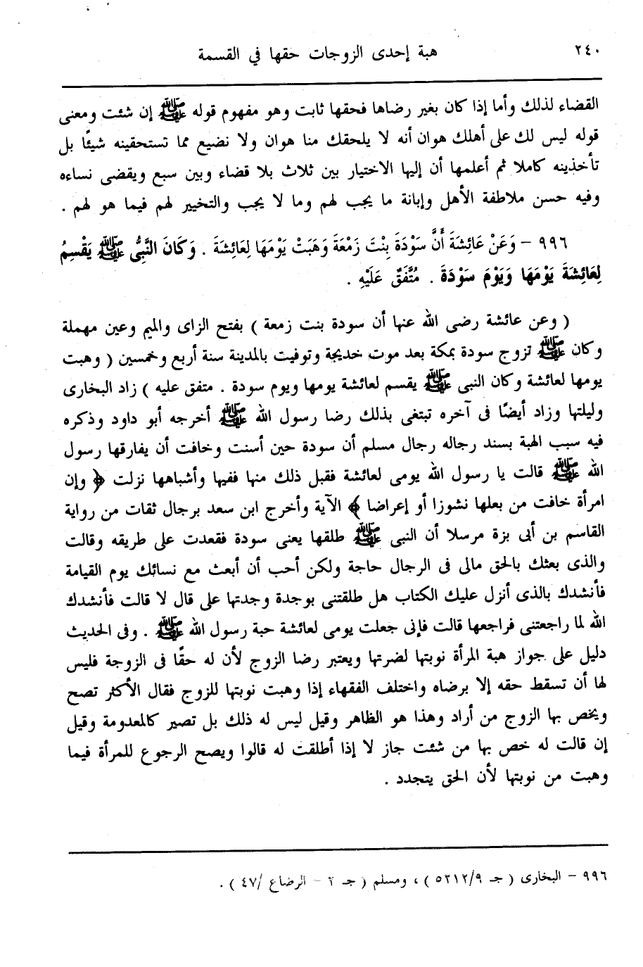 (996) - وَعَنْ عَائِشَةَ - رَضِيَ اللَّهُ عَنْهَا - «أَنَّ سَوْدَةَ بِنْتَ زَمْعَةَ وَهَبَتْ يَوْمَهَا لِعَائِشَةَ. وَكَانَ النَّبِيُّ - صَلَّى اللَّهُ عَلَيْهِ وَسَلَّمَ - يَقْسِمُ لِعَائِشَةَ يَوْمَهَا وَيَوْمَ سَوْدَةَ» مُتَّفَقٌ عَلَيْهِ