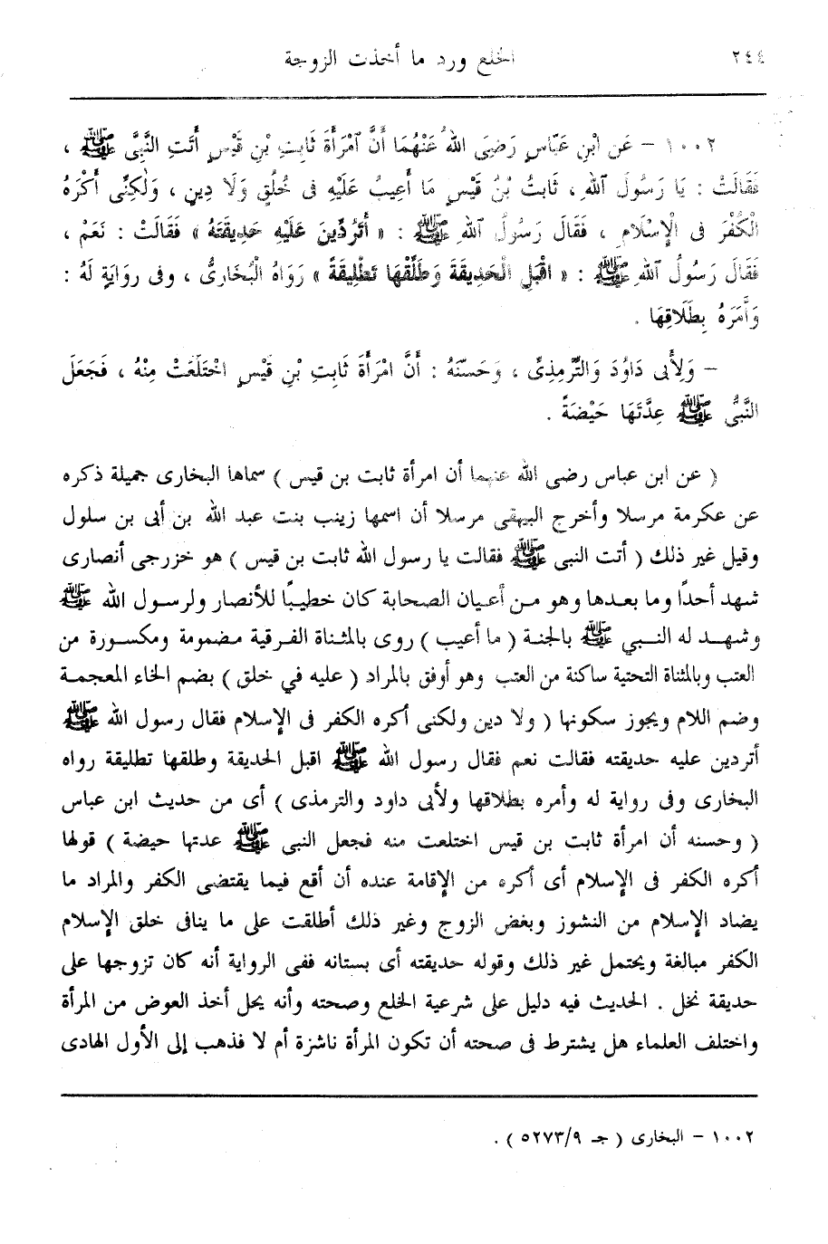 (1002) - عَنْ ابْنِ عَبَّاسٍ - رَضِيَ اللَّهُ عَنْهُمَا - «أَنَّ امْرَأَةَ ثَابِتِ بْنِ قَيْسٍ أَتَتْ النَّبِيَّ - صَلَّى اللَّهُ عَلَيْهِ وَسَلَّمَ - فَقَالَتْ: يَا رَسُولَ اللَّهِ، ثَابِتُ بْنُ قَيْسٍ مَا أَعِيبُ عَلَيْهِ فِي خُلُقٍ وَلَا دِينٍ، وَلَكِنِّي أَكْرَهُ الْكُفْرَ فِي الْإِسْلَامِ، فَقَالَ رَسُولُ اللَّهِ - صَلَّى اللَّهُ عَلَيْهِ وَسَلَّمَ -: أَتَرُدِّينَ عَلَيْهِ حَدِيقَتَهُ فَقَالَتْ: نَعَمْ، فَقَالَ رَسُولُ اللَّهِ - صَلَّى اللَّهُ عَلَيْهِ وَسَلَّمَ -: اقْبَلْ الْحَدِيقَةَ وَطَلِّقْهَا تَطْلِيقَةً» رَوَاهُ الْبُخَارِيُّ، وَفِي رِوَايَةٍ لَهُ: «، وَأَمَرَهُ بِطَلَاقِهَا» - وَلِأَبِي دَاوُد، وَالتِّرْمِذِيِّ، وَحَسَّنَهُ: «أَنَّ امْرَأَةَ ثَابِتِ بْنِ قَيْسٍ اخْتَلَعَتْ مِنْهُ، فَجَعَلَ النَّبِيُّ - صَلَّى اللَّهُ عَلَيْهِ وَسَلَّمَ - عِدَّتَهَا حَيْضَةً»