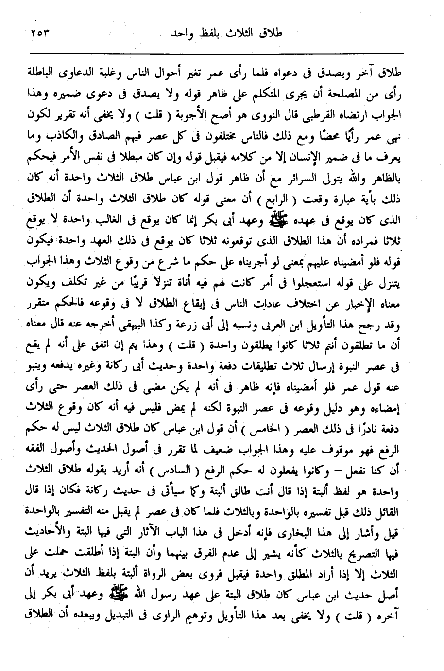 (قُلْت) : وَهَذَا يَتِمُّ إنْ اُتُّفِقَ عَلَى أَنَّهُ لَمْ يَقَعْ فِي عَصْرِ النُّبُوَّةِ إرْسَالُ ثَلَاثِ تَطْلِيقَاتٍ دَفْعَةً وَاحِدَةً وَحَدِيثُ أَبِي رُكَانَةَ وَغَيْرِهِ يَدْفَعُهُ وَيَنْبُو عَنْهُ قَوْلُ عُمَرَ فَلَوْ أَمْضَيْنَاهُ، فَإِنَّهُ ظَاهِرٌ فِي أَنَّهُ لَمْ يَكُنْ مَضَى فِي ذَلِكَ الْعَصْرِ حَتَّى رَأَى إمْضَاءَهُ، وَهُوَ دَلِيلُ وُقُوعِهِ فِي عَصْرِ النُّبُوَّةِ لَكِنَّهُ لَمْ يَمْضِ فَلَيْسَ فِيهِ أَنَّهُ كَانَ وُقُوعُ الثَّلَاثِ دَفْعَةً نَادِرًا فِي ذَلِكَ الْعَصْرِ.