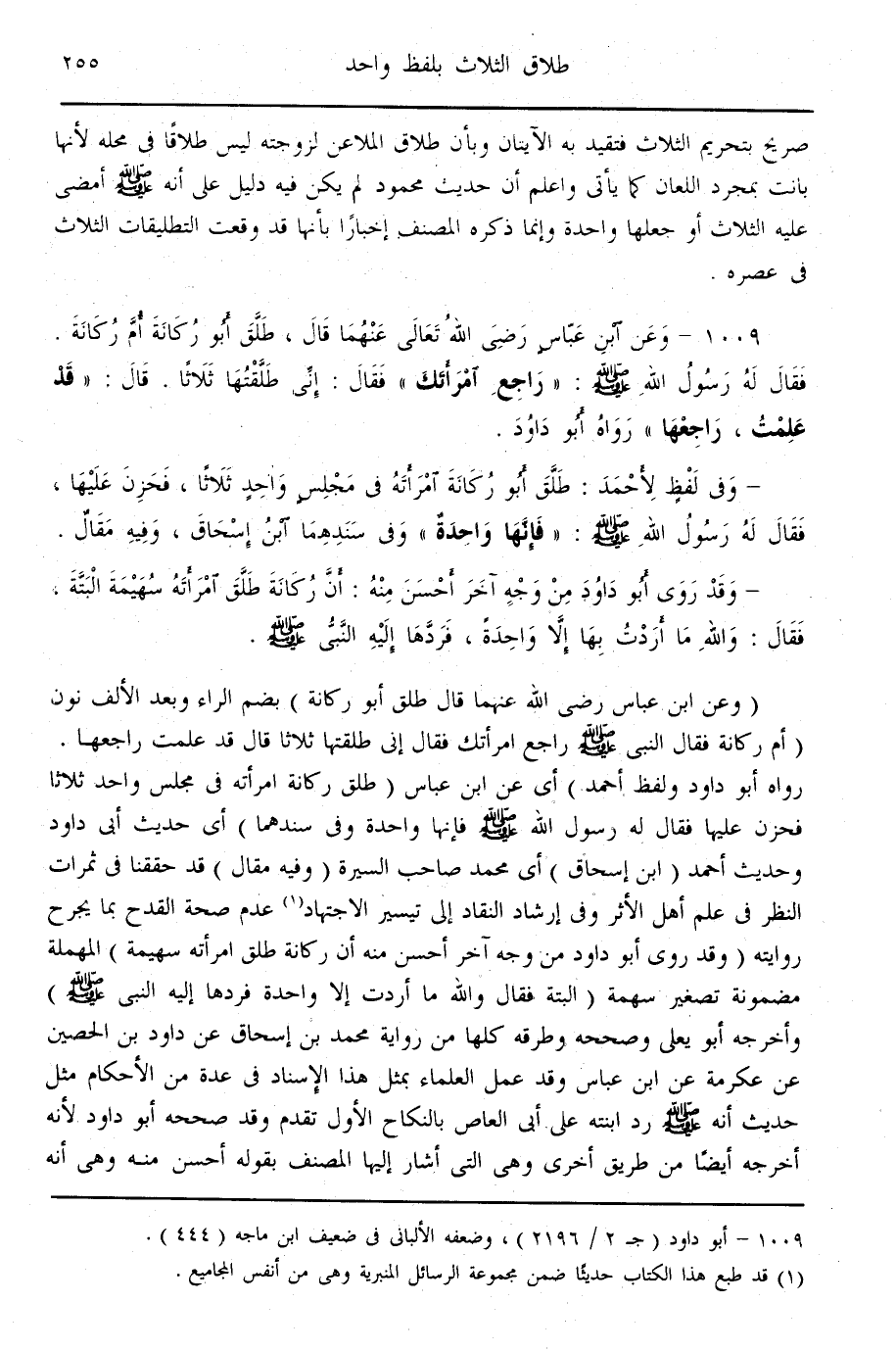 (1009) - وَعَنْ ابْنِ عَبَّاسٍ - رَضِيَ اللَّهُ تَعَالَى عَنْهُمَا - قَالَ: «طَلَّقَ أَبُو رُكَانَةَ أُمَّ رُكَانَةَ، فَقَالَ لَهُ رَسُولُ اللَّهِ - صَلَّى اللَّهُ عَلَيْهِ وَسَلَّمَ -: رَاجِعْ امْرَأَتَك، فَقَالَ: إنِّي طَلَّقْتهَا ثَلَاثًا. قَالَ: قَدْ عَلِمْت، رَاجِعْهَا» رَوَاهُ أَبُو دَاوُد -. وَفِي لَفْظٍ لِأَحْمَدَ: «طَلَّقَ أَبُو رُكَانَةَ امْرَأَتَهُ فِي مَجْلِسٍ وَاحِدٍ ثَلَاثًا، فَحَزِنَ عَلَيْهَا، فَقَالَ لَهُ رَسُولُ اللَّهِ - صَلَّى اللَّهُ عَلَيْهِ وَسَلَّمَ -: فَإِنَّهَا وَاحِدَةٌ» . وَفِي سَنَدِهِمَا ابْنُ إِسْحَاقَ، وَفِيهِ مَقَالٌ. وَقَدْ رَوَى أَبُو دَاوُد مِنْ وَجْهٍ آخَرَ أَحْسَنَ مِنْهُ: «أَنَّ رُكَانَةَ طَلَّقَ امْرَأَتَهُ سُهَيْمَةَ أَلْبَتَّةَ، فَقَالَ: وَاَللَّهِ مَا أَرَدْت بِهَا إلَّا وَاحِدَةً، فَرَدَّهَا إلَيْهِ النَّبِيُّ - صَلَّى اللَّهُ عَلَيْهِ وَسَلَّمَ -» .