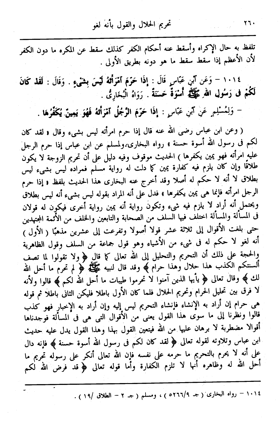 (1014) - وَعَنْ ابْنِ عَبَّاسٍ قَالَ: إذَا حَرَّمَ امْرَأَتَهُ لَيْسَ بِشَيْءٍ. وَقَالَ: لَقَدْ كَانَ لَكُمْ فِي رَسُولِ اللَّهِ - صَلَّى اللَّهُ عَلَيْهِ وَسَلَّمَ - أُسْوَةٌ حَسَنَةٌ رَوَاهُ الْبُخَارِيُّ - وَلِمُسْلِمٍ عَنْ ابْنِ عَبَّاسٍ: إذَا حَرَّمَ الرَّجُلُ امْرَأَتَهُ، فَهُوَ يَمِينٌ يُكَفِّرُهَا.