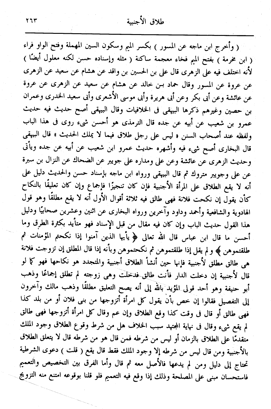 ـــــــــــــــــــــــــــــQوَأَخْرَجَ ابْنُ مَاجَهْ عَنْ الْمِسْوَرِ - بِكَسْرِ الْمِيمِ وَسُكُونِ السِّينِ الْمُهْمَلَةِ وَفَتْحِ الْوَاوِ فَرَاءٍ - بْنِ مَخْرَمَةَ) بِفَتْحِ الْمِيمِ فَخَاءٍ مُعْجَمَةٍ سَاكِنَةٍ (مِثْلَهُ وَإِسْنَادُهُ حَسَنٌ لَكِنَّهُ مَعْلُولٌ أَيْضًا) ؛ لِأَنَّهُ اُخْتُلِفَ فِيهِ عَلَى الزُّهْرِيِّ قَالَ عَلِيُّ بْنُ الْحُسَيْنِ بْنُ وَاقِدٍ عَنْ هِشَامٍ عَنْ سَعِيدٍ عَنْ الزُّهْرِيِّ عَنْ عُرْوَةَ عَنْ الْمِسْوَرِ، وَقَالَ حَمَّادُ بْنُ خَالِدٍ عَنْ هِشَامٍ عَنْ سَعِيدٍ عَنْ الزُّهْرِيِّ عَنْ عُرْوَةَ عَنْ عَائِشَةَ وَعَنْ أَبِي بَكْرٍ وَعَنْ أَبِي هُرَيْرَةَ وَأَبِي مُوسَى الْأَشْعَرِيِّ وَأَبِي سَعِيدٍ الْخُدْرِيِّ وَعِمْرَانَ بْنِ حُصَيْنٍ وَغَيْرِهِمْ. ذَكَرَهَا الْبَيْهَقِيُّ فِي الْخِلَافِيَّاتِ، وَقَالَ الْبَيْهَقِيُّ أَصَحُّ حَدِيثٍ فِي حَدِيثِ عَمْرِو بْنِ شُعَيْبٍ عَنْ أَبِيهِ عَنْ جَدِّهِ قَالَ التِّرْمِذِيُّ هُوَ أَحْسَنُ شَيْءٍ رُوِيَ فِي هَذَا الْبَابِ وَلَفْظُهُ عِنْدَ أَصْحَابِ السُّنَنِ «لَيْسَ عَلَى رَجُلٍ طَلَاقٌ فِيمَا لَا يَمْلِكُ» الْحَدِيثَ " قَالَ الْبَيْهَقِيُّ قَالَ الْبُخَارِيُّ أَصَحُّ شَيْءٍ فِيهِ وَأَشْهَرُهُ حَدِيثُ عَمْرِو بْنِ شُعَيْبٍ عَنْ أَبِيهِ عَنْ جَدِّهِ وَيَأْتِي وَحَدِيثُ الزُّهْرِيِّ عَنْ عَائِشَةَ وَعَنْ عَلِيٍّ وَمَدَارُهُ عَلَى جُوَيْبِرٍ عَنْ الضَّحَّاكِ عَنْ النَّزَّالِ بْنِ سَبْرَةَ عَنْ عَلِيٍّ وَجُوَيْبِرٌ مَتْرُوكٌ ثُمَّ قَالَ الْبَيْهَقِيُّ: وَرَوَاهُ ابْنُ مَاجَهْ بِإِسْنَادٍ حَسَنٍ.